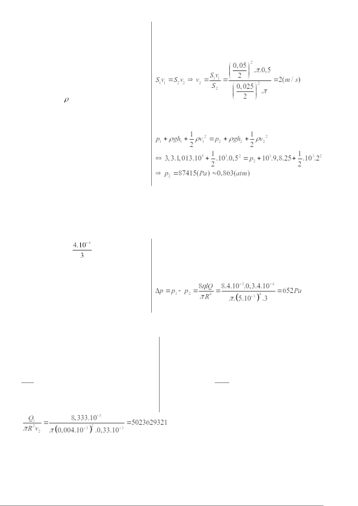 độ nhớt của nước. Biết rằng 1 atm = 1,01.105 N/m2 và g = 9,8 m/s2. Bài làm: lOMoAR cPSD| 45470709 p1 = 3,3 atm v1 =0,5 m/s Giải: d1 = 5 cm d2 = 2,5 cm h =