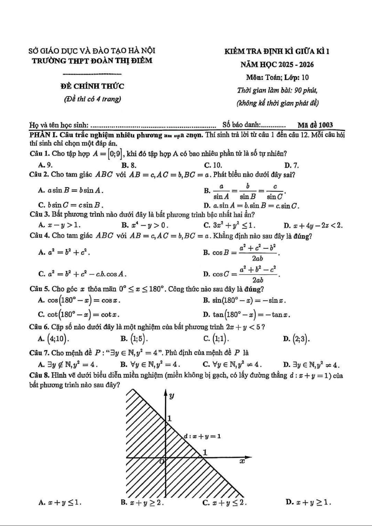 Đề kiểm tra giữa kỳ 1 Toán 10 năm 2025-2026 – THPT Đoàn Thị Điểm, Hà Nội