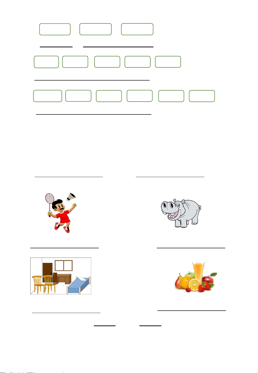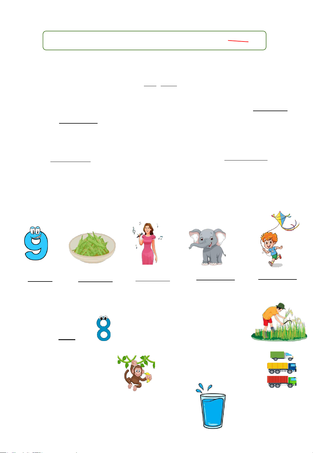 II. Look, read and complete. 1. NURSE 2. WINDOWS 3. SKIPPING 4. JUICE PART C: WRITING I. Reorder the letters 1. BEANS/BEAN 2.SINGER 3. ELEPHANT 4. FLY AKITE/ FLYING A KITE II. Look and write 1. farmer 2. swinging 3. trucks 4. water III. Reorder the words 1. My sister is a nurse.