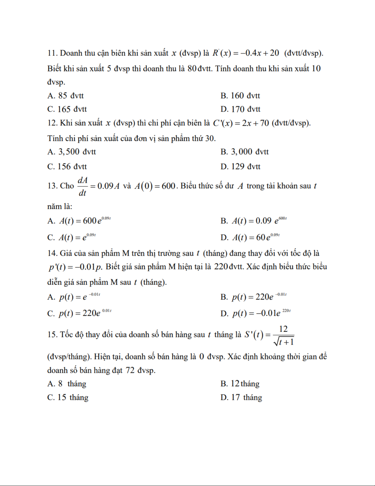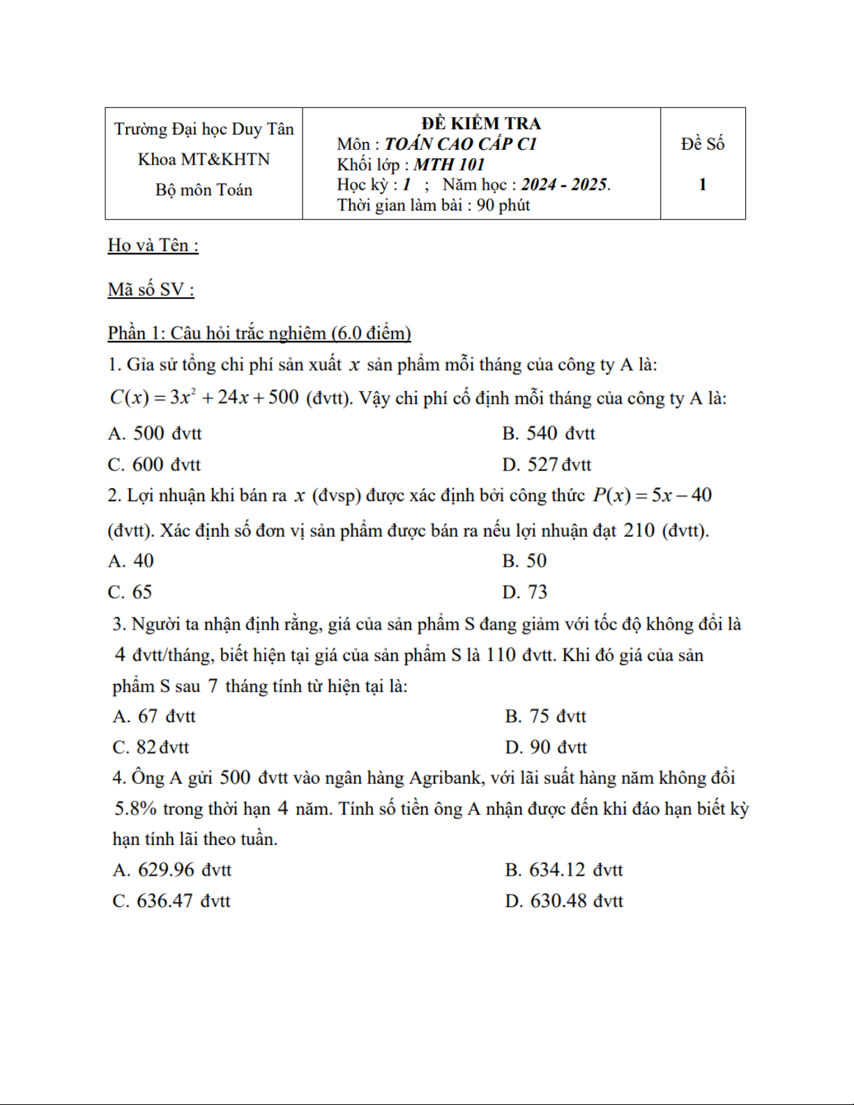 Đề kiểm tra học kỳ 1 năm 2024 - 2025 môn Toán cao cấp C1 | Trường Đại học Duy Tân