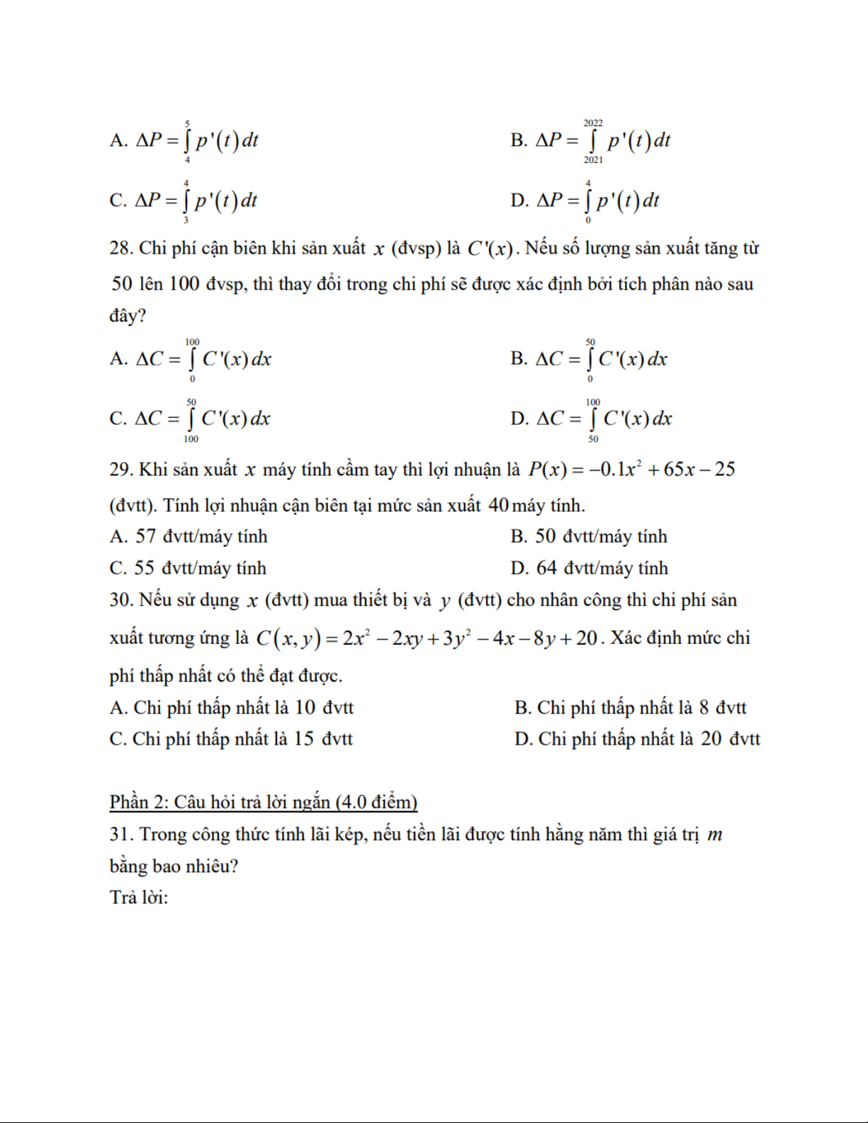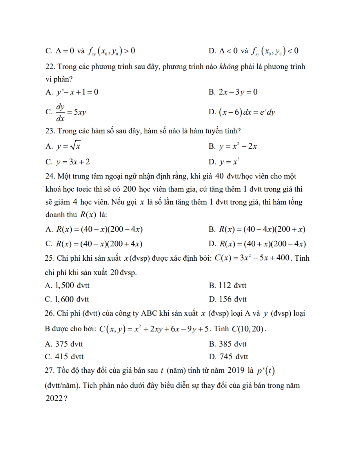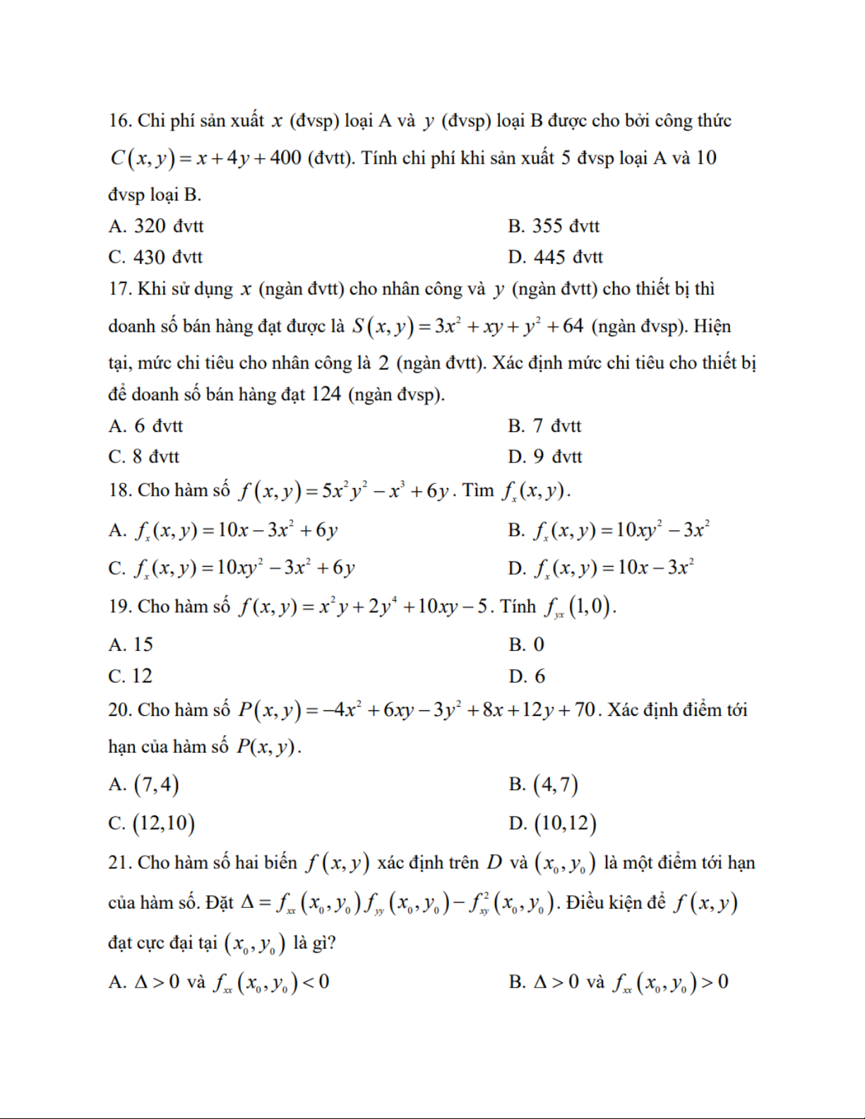 Bài tập ôn thi cuối kỳ: Câu hỏi trắc nghiệm và tự luận môn Toán cao cấp C1 | Trường Đại học Duy Tân