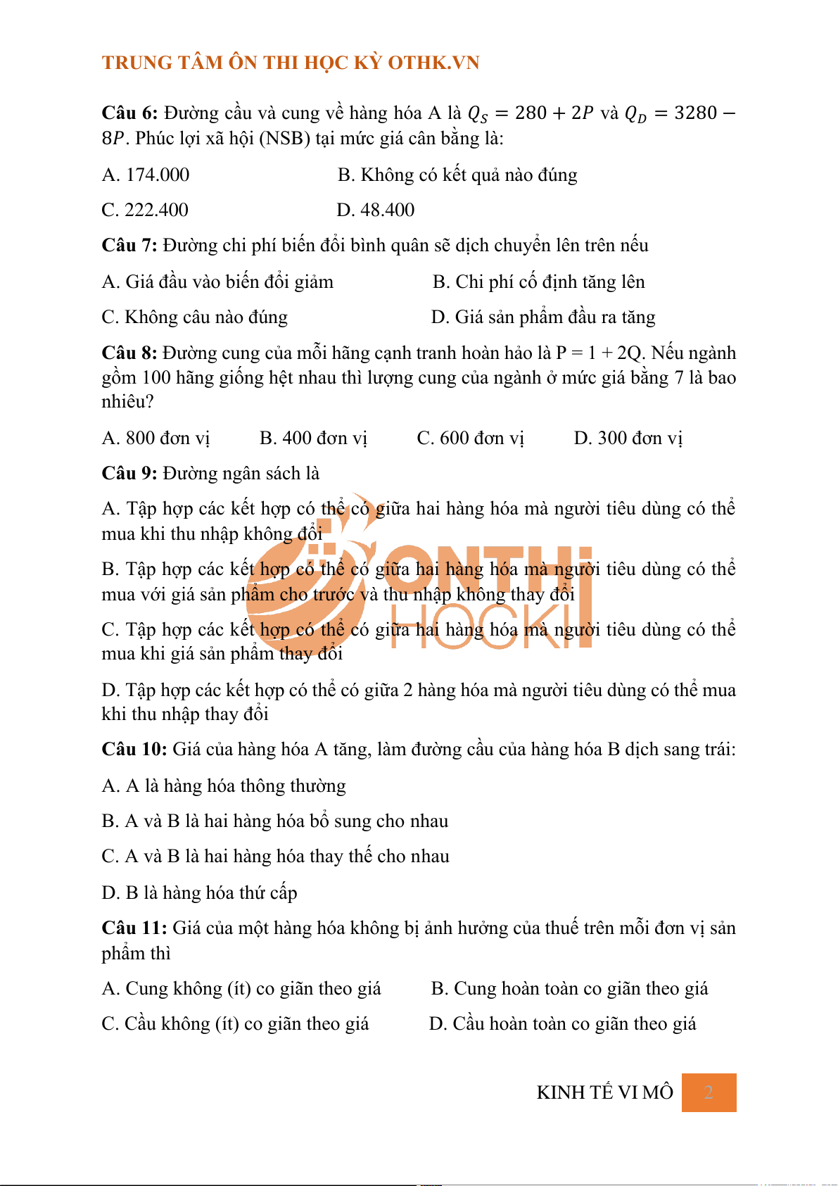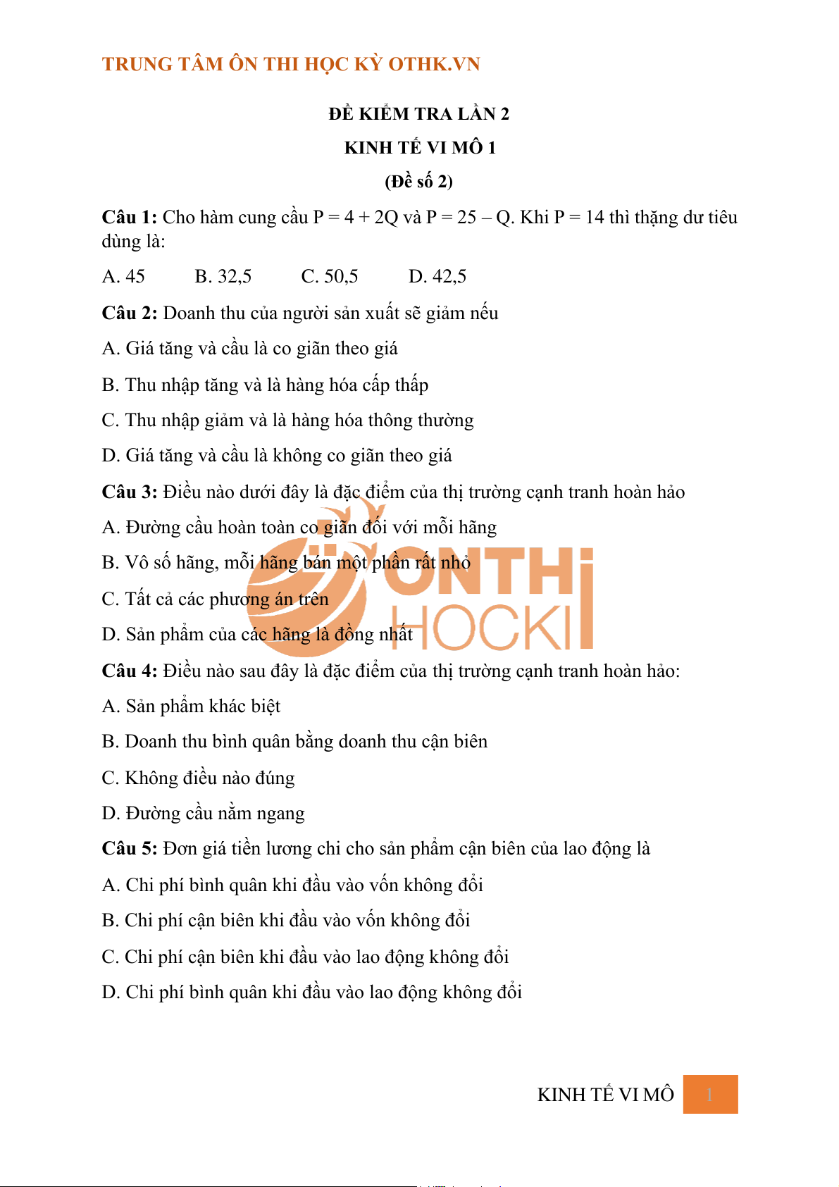 ĐỀ KIỂM TRA LẦN 2 KINH TẾ VI MÔ 1 (Đề số 2)