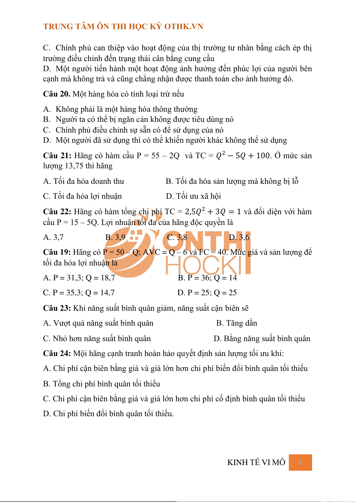 Câu 19: Hãng có P = 50 – Q; AVC = Q – 6 và FC = 40. Mức giá và sản lượng để