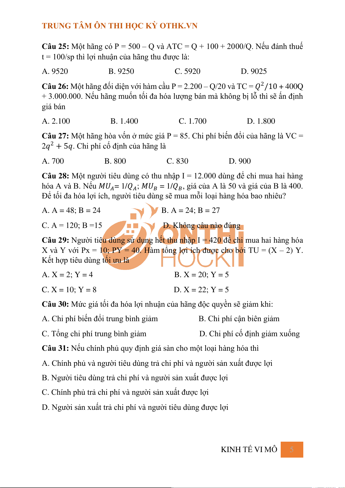Câu 26: Một hãng đối diện với hàm cầu P = 2.200 – Q/20 và TC = 𝑄2/10 + 400Q