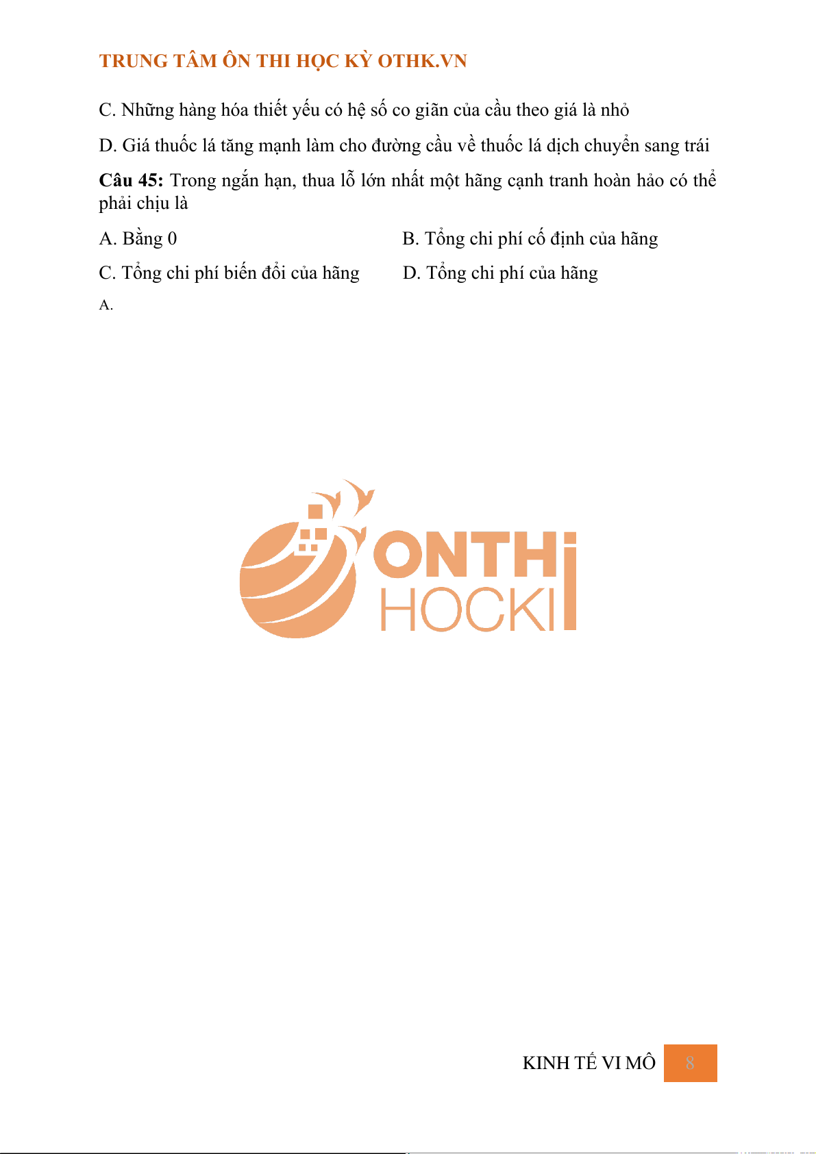 C. Tổng chi phí biến đổi của hãng D. Tổng chi phí của hãng A. KINH TẾ VI MÔ 8