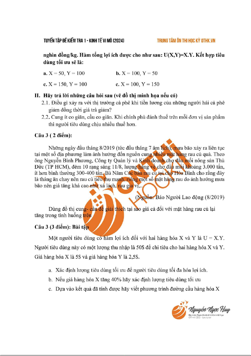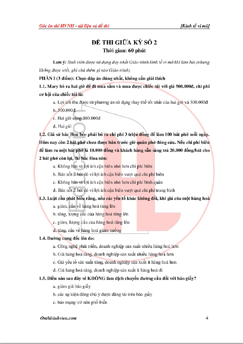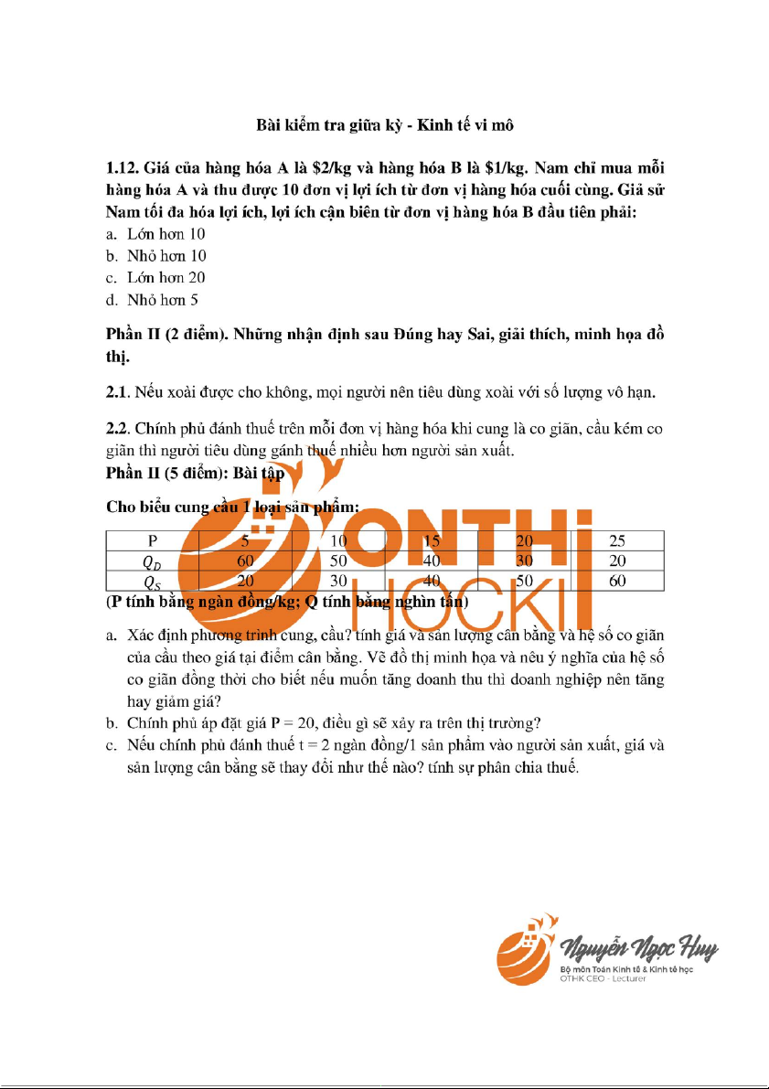 Đề kiểm tra môn Kinh tế vi mô | Học viện Ngân hàng