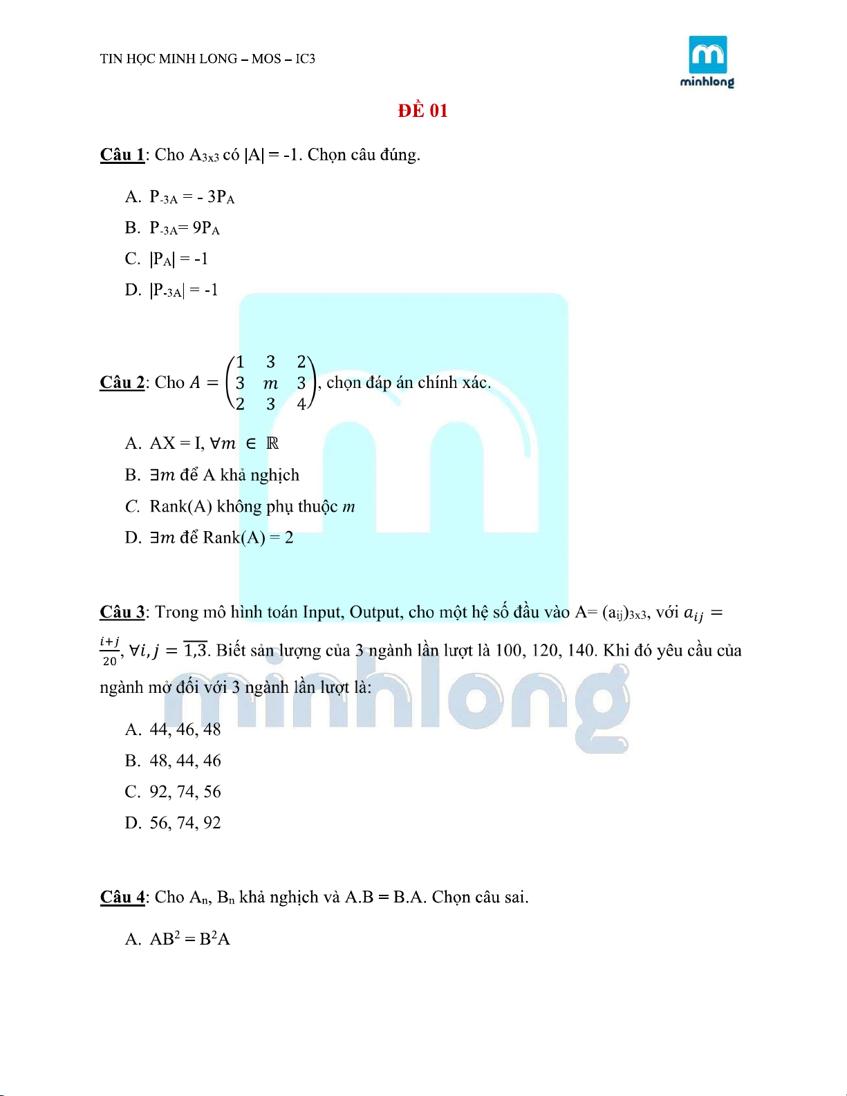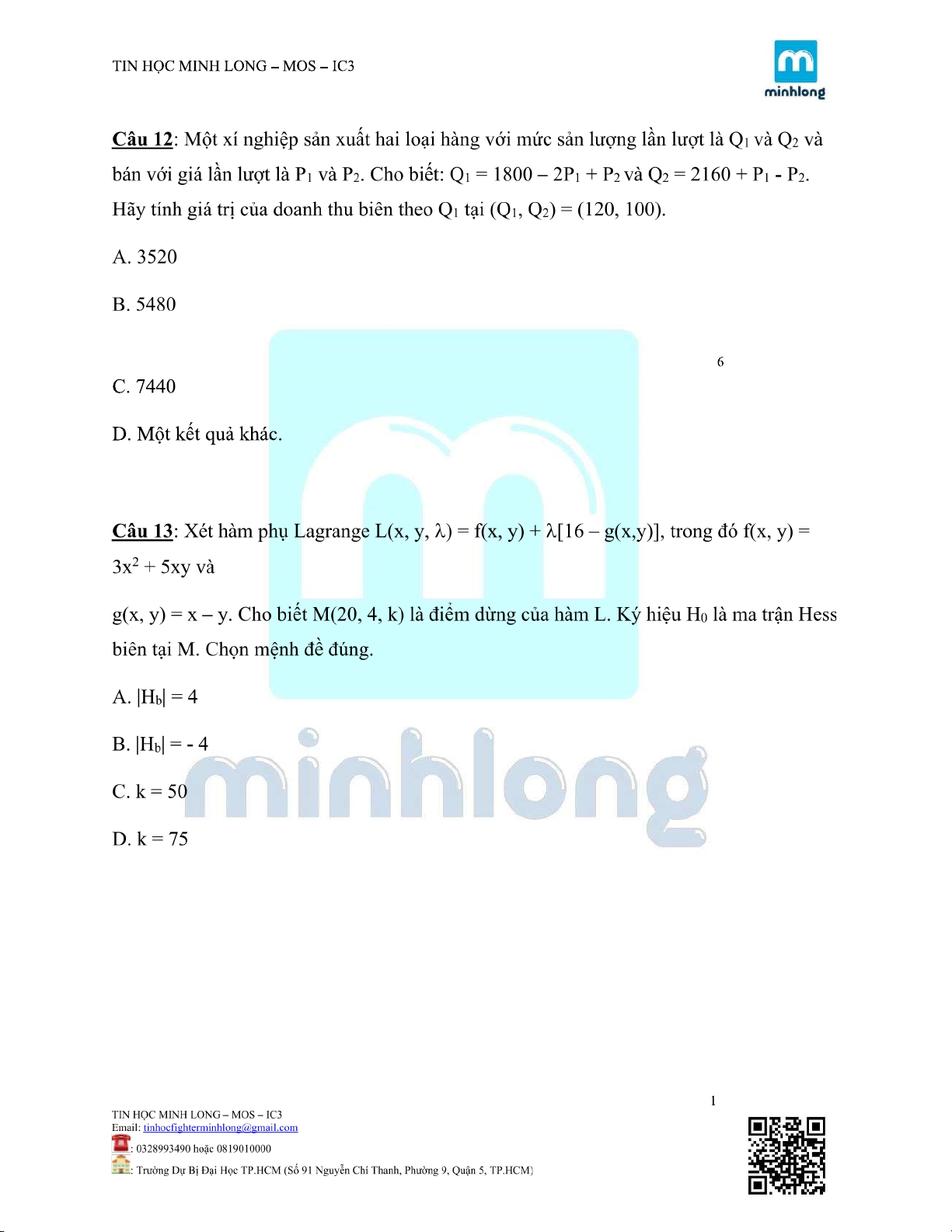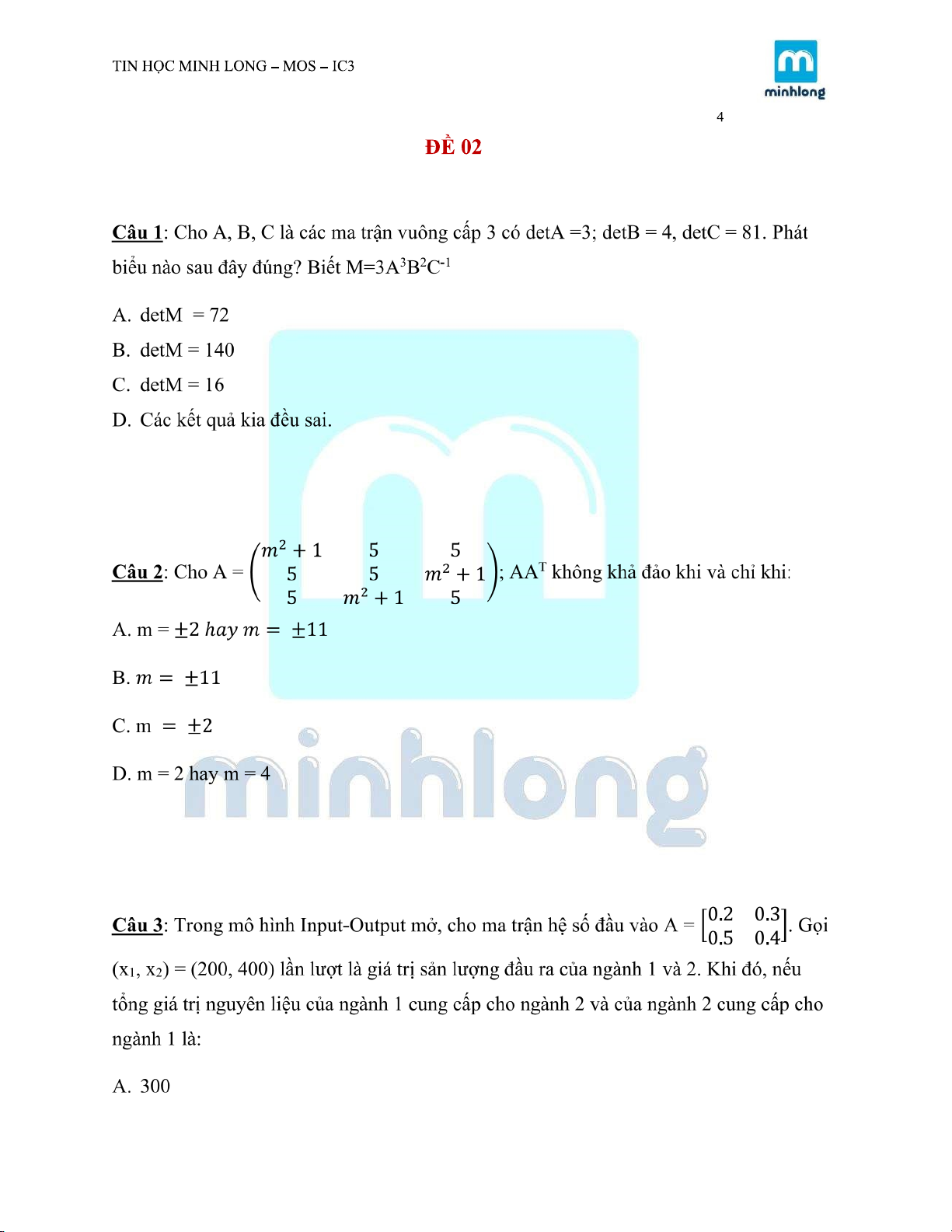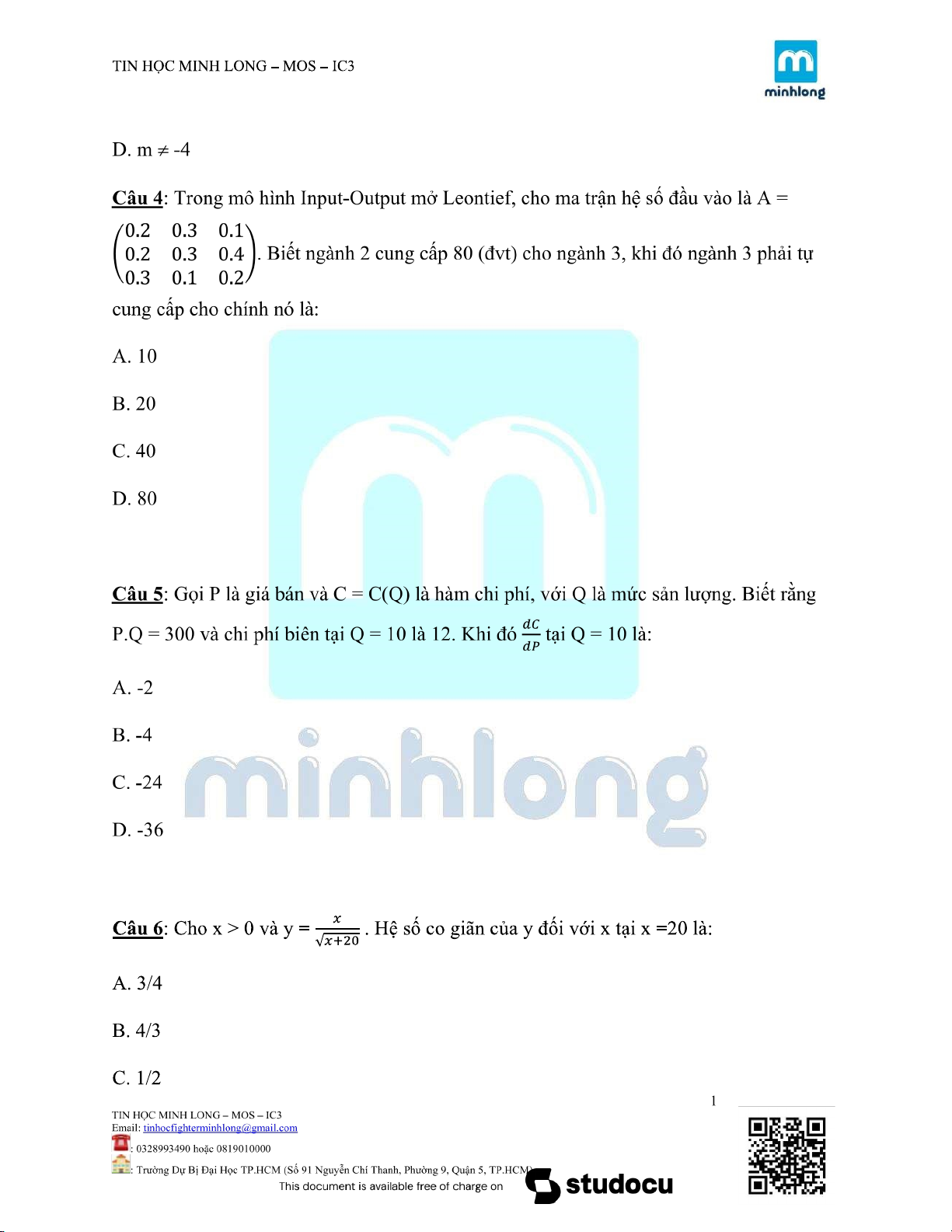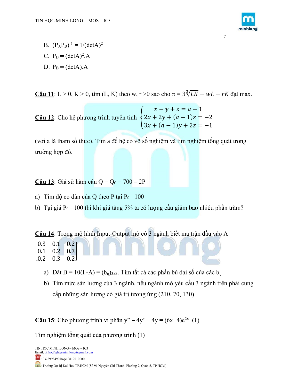 ĐỀ KIỂM TRA MÔN TOÁN KINH TẾ |Trường Đại học Kinh tế Thành phố Hồ Chí Minh