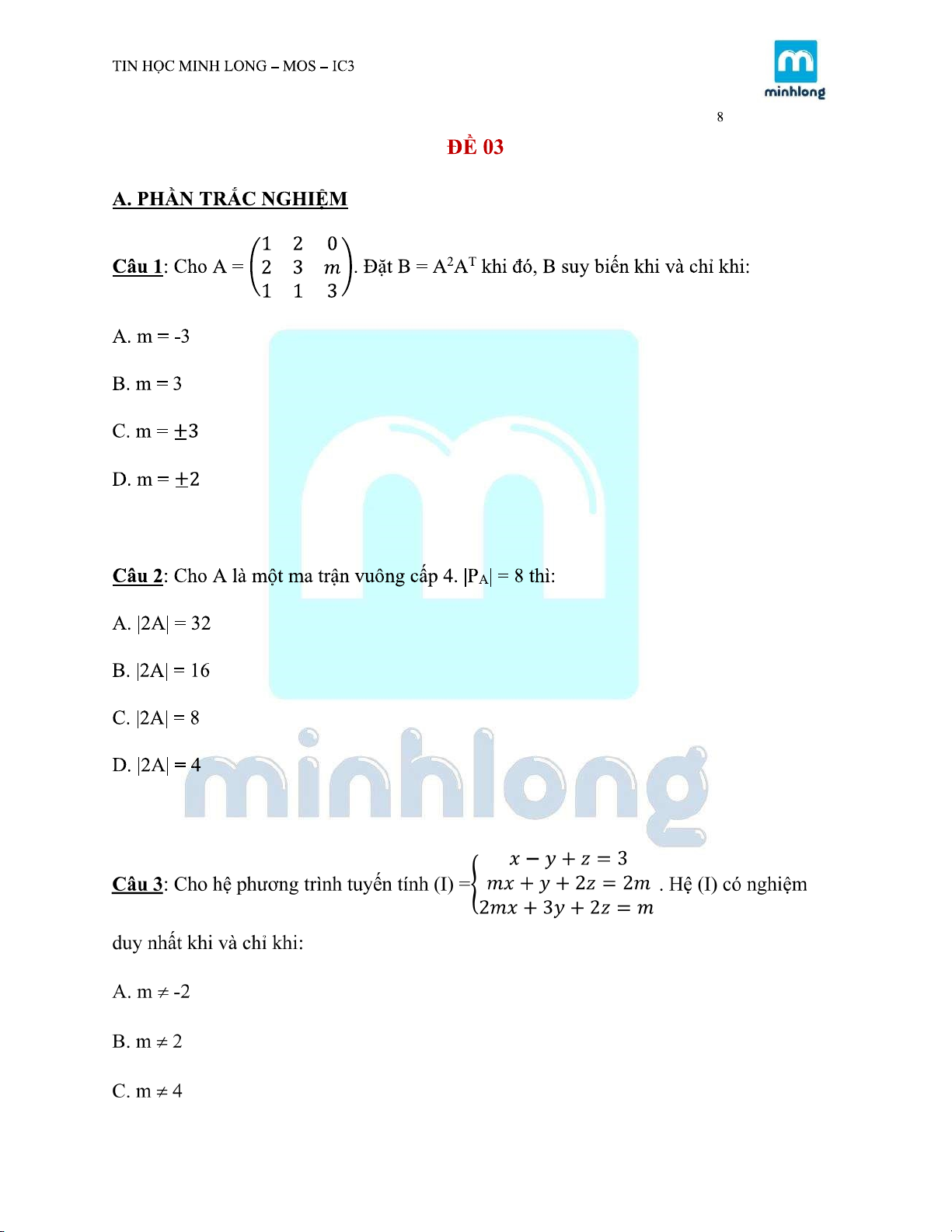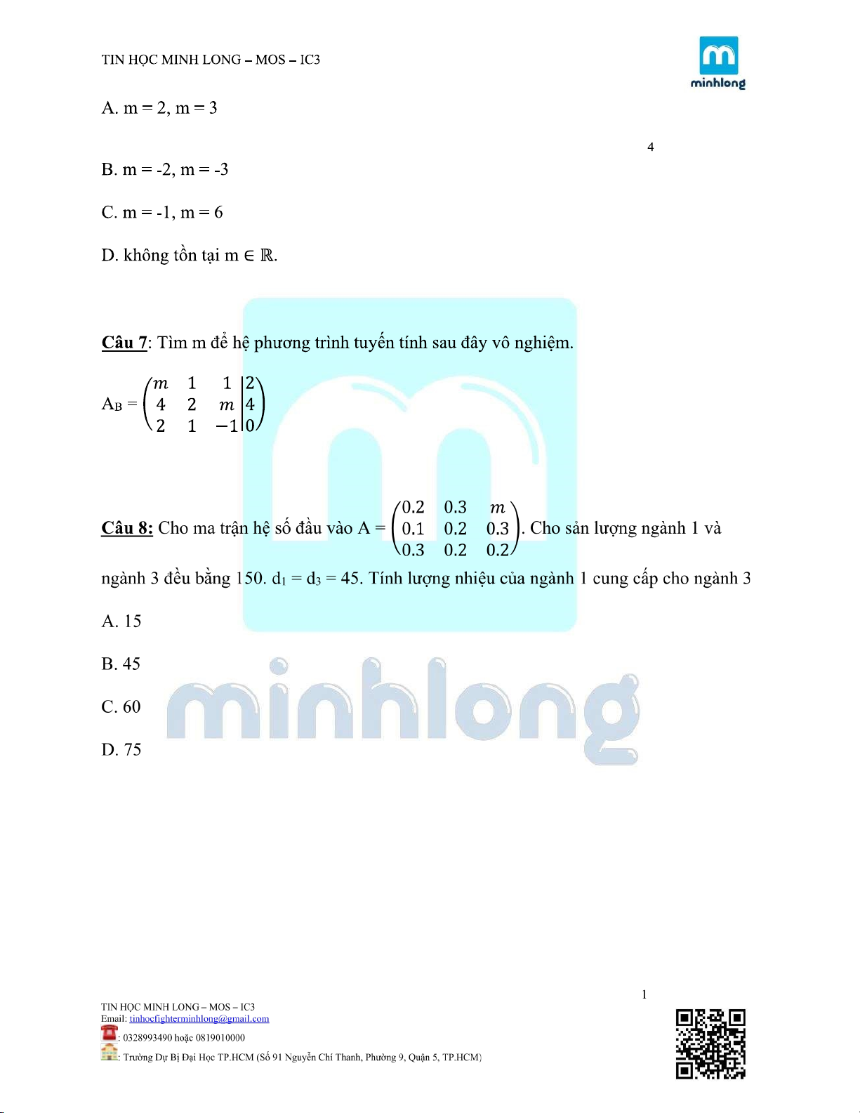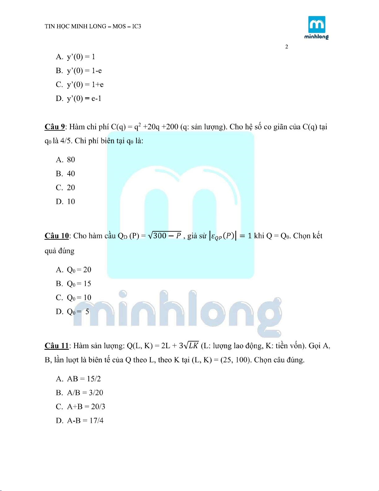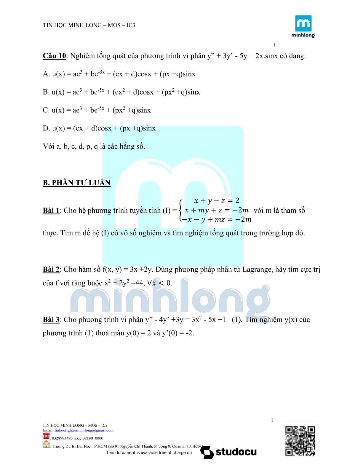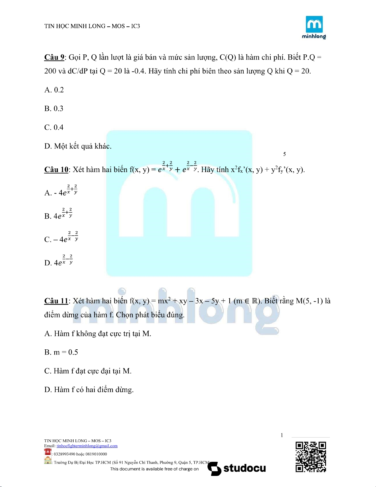 ĐỀ KIỂM TRA MÔN TOÁN KINH TẾ |Trường Đại học Kinh tế Thành phố Hồ Chí Minh