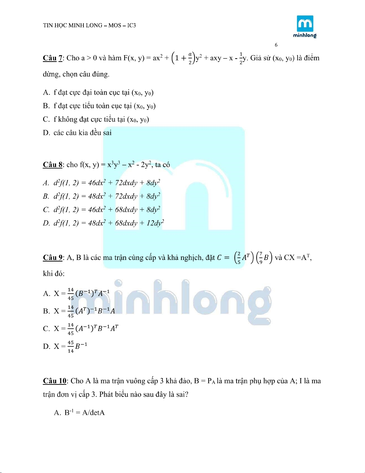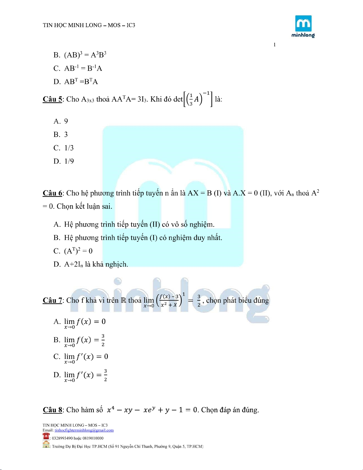 Nội dung ôn tập chương 2 | Môn toán cao cấp