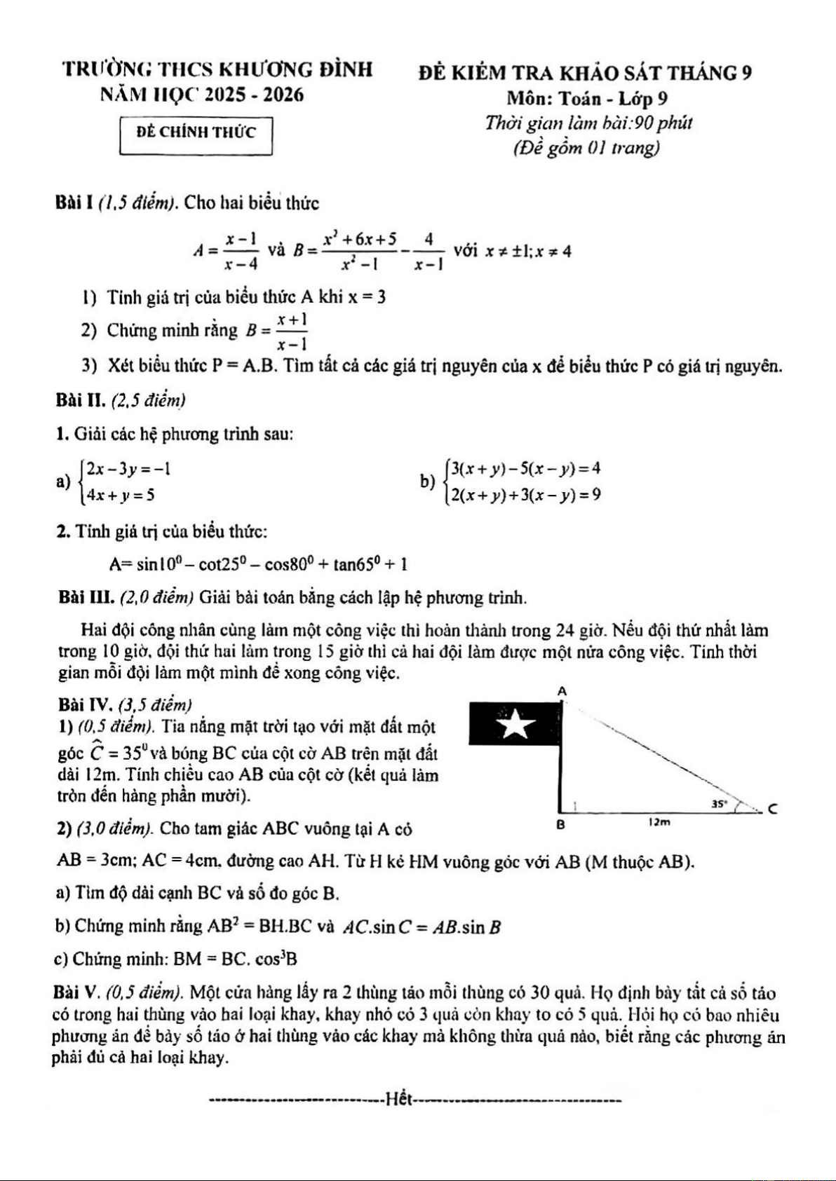 Giới thiệu đến quý thầy, cô giáo và các em học sinh đề kiểm tra khảo sát môn Toán 9 tháng 9 năm học 2025 – 2026 trường THCS Khương Đình, thành phố Hà Nội.