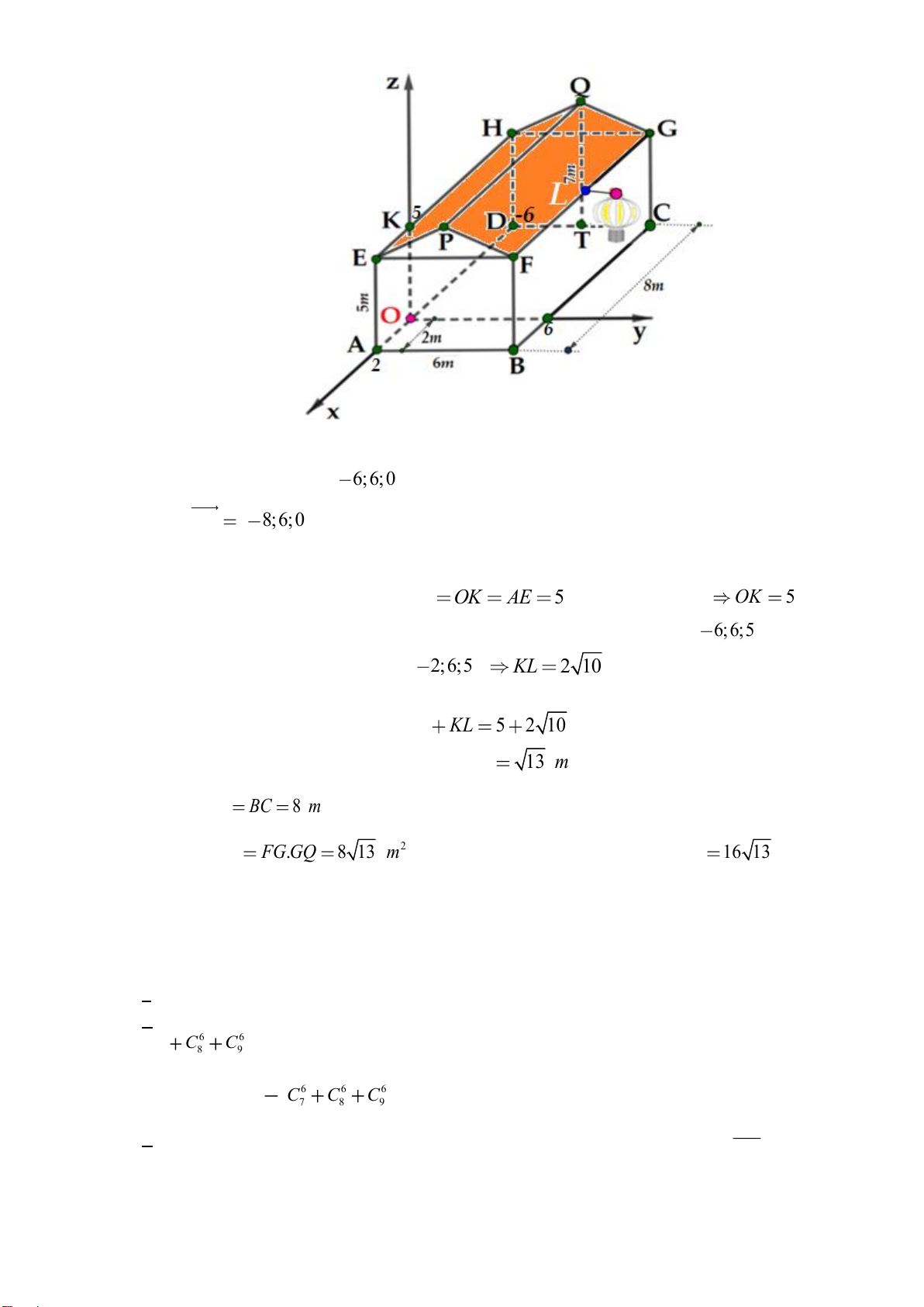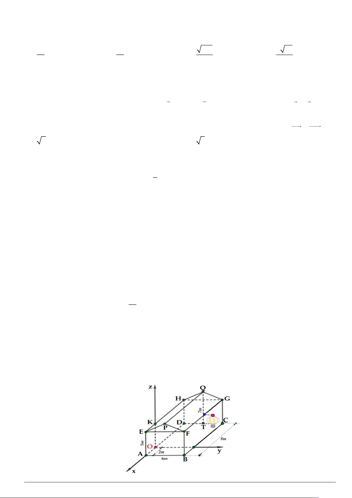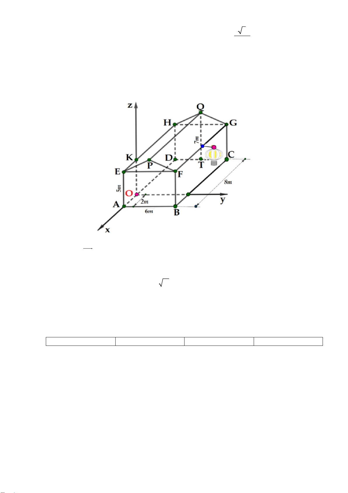 AE = 5m, AD = 8m, QT = 7m. Xét hệ trục toạ độ Oxyz sao cho gốc toạ độ là điểm O thuộc đoạn AD sao