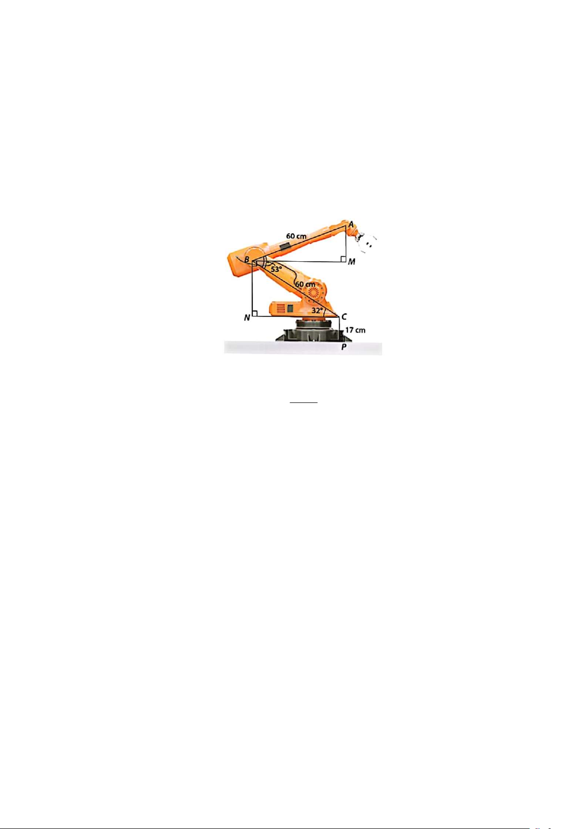 Câu 14 (0,5 điểm). Cánh tay rô-bốt đặt trên mặt đất và có vị trí như hình vẽ, biết AB  60cm,  BC  60c , m  BCN  32 ,   ABC  53 .