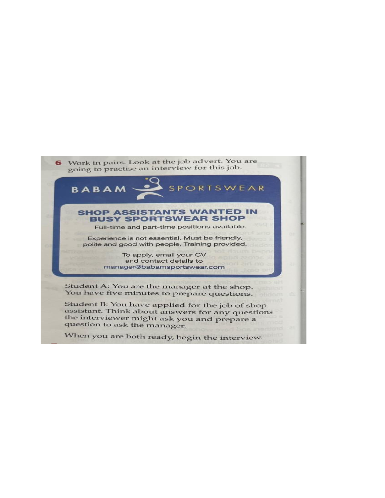 recruitment@vinmart.com Part 2: Job interview CARD FOR STUDENT B