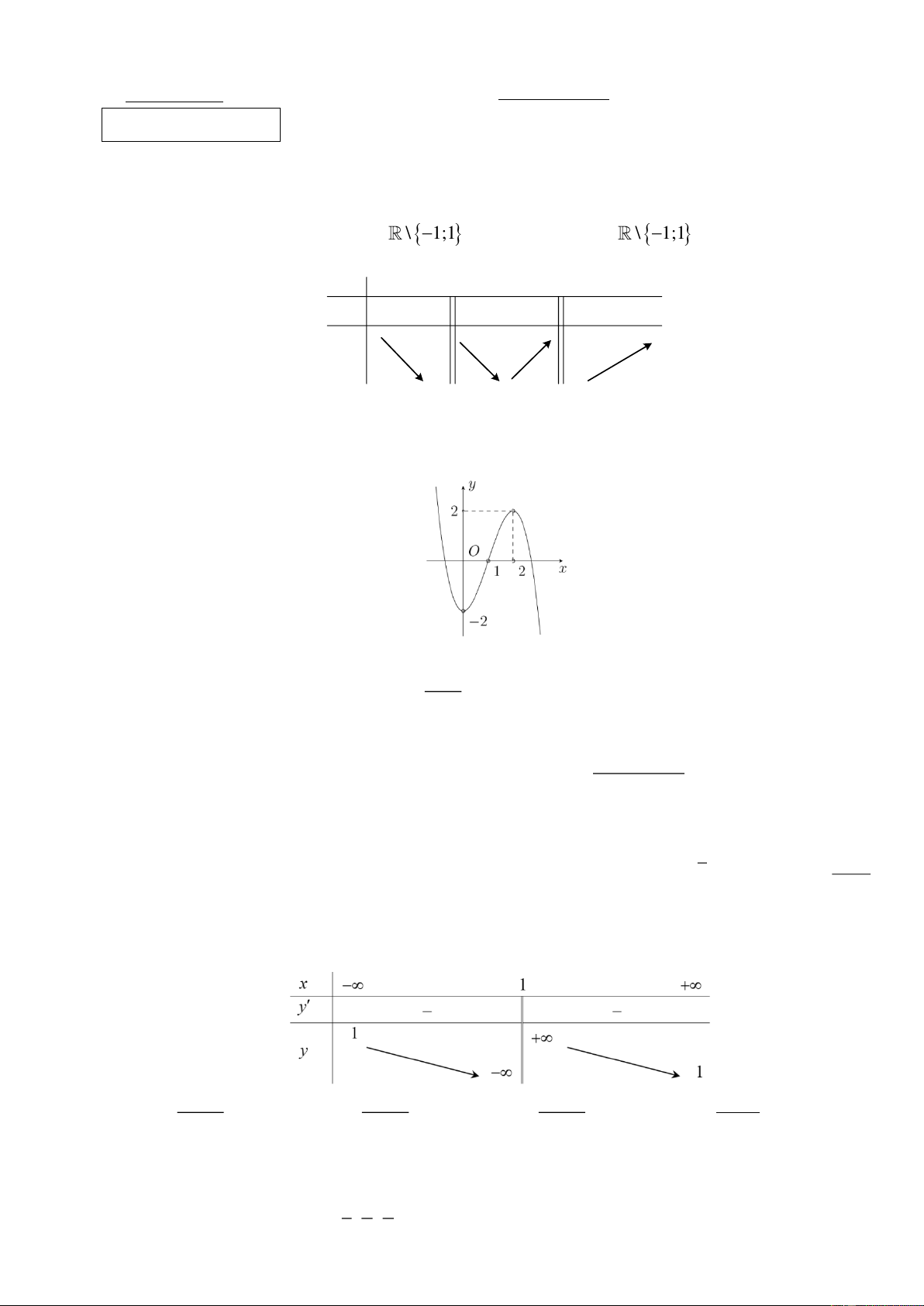 Cho hàm số bậc ba y = f ( x) có đồ thị như hình vẽ bên. Hàm số đồng biến trên A. ( 1 − ; ) 1 . B. (− ; − ) 1 . C. (2;+) . D. (0 ) ;1 . x Câu 2:
