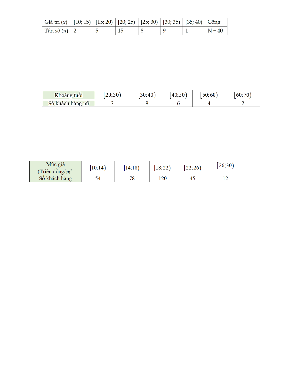 Giá trị đại diện của nhóm 30; 40) là: A. 40 . B. 30 . C. 35 . D. 9 . Câu 8: