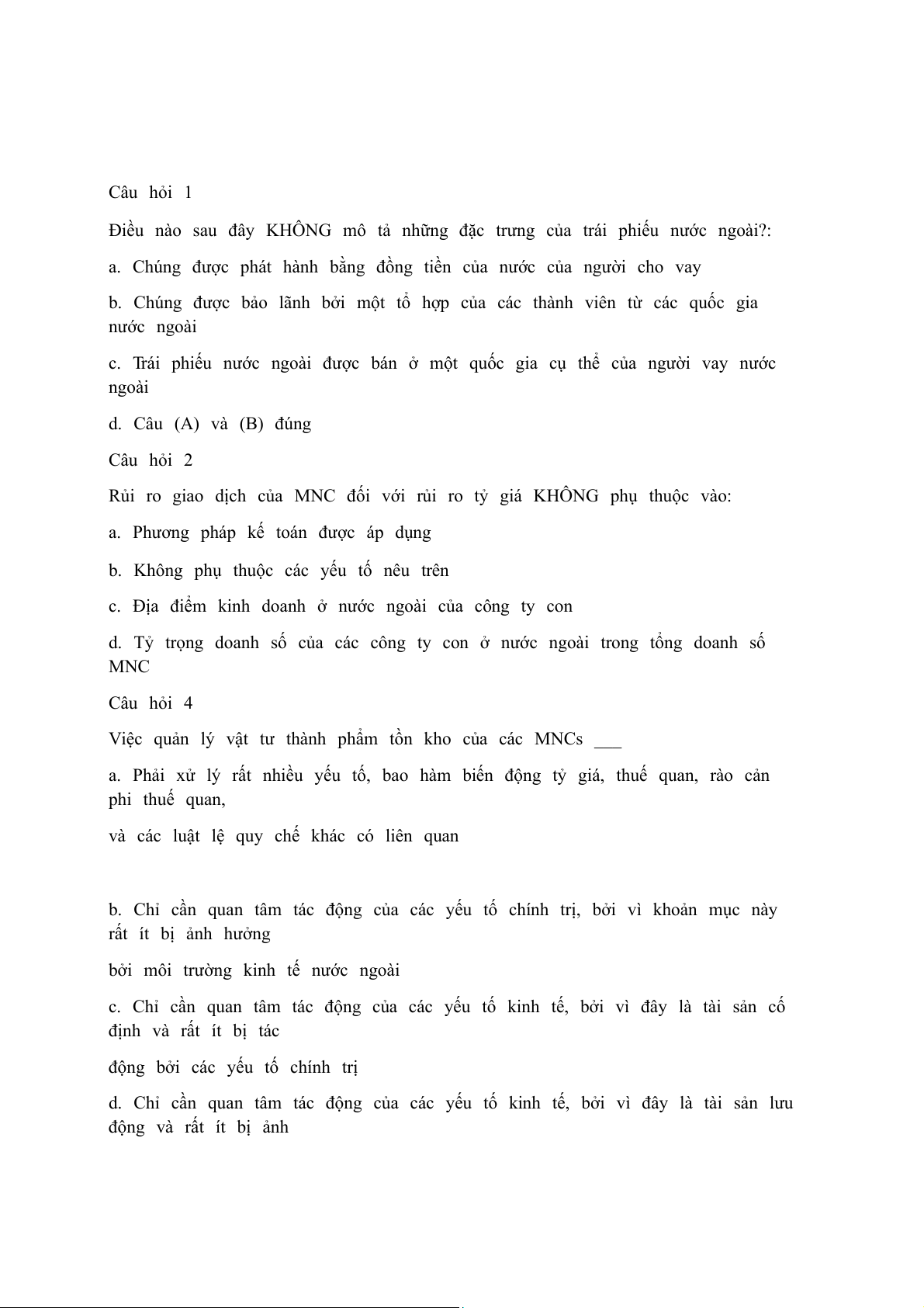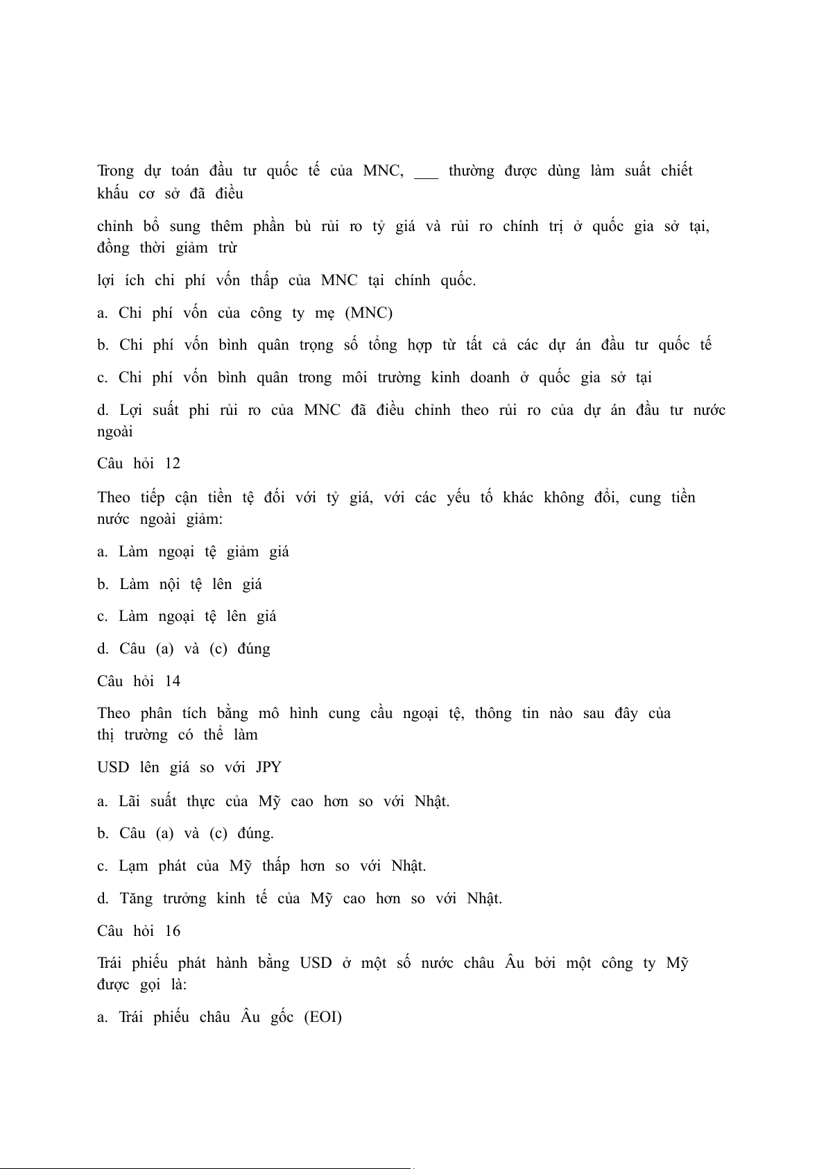 d. Lợi suất phi rủi ro của MNC đã điều chỉnh theo rủi ro của dự án đầu tư nước ngoài Câu hỏi 12