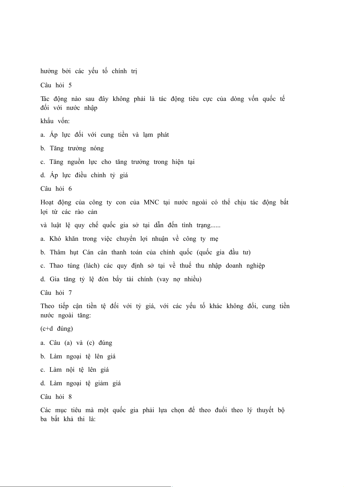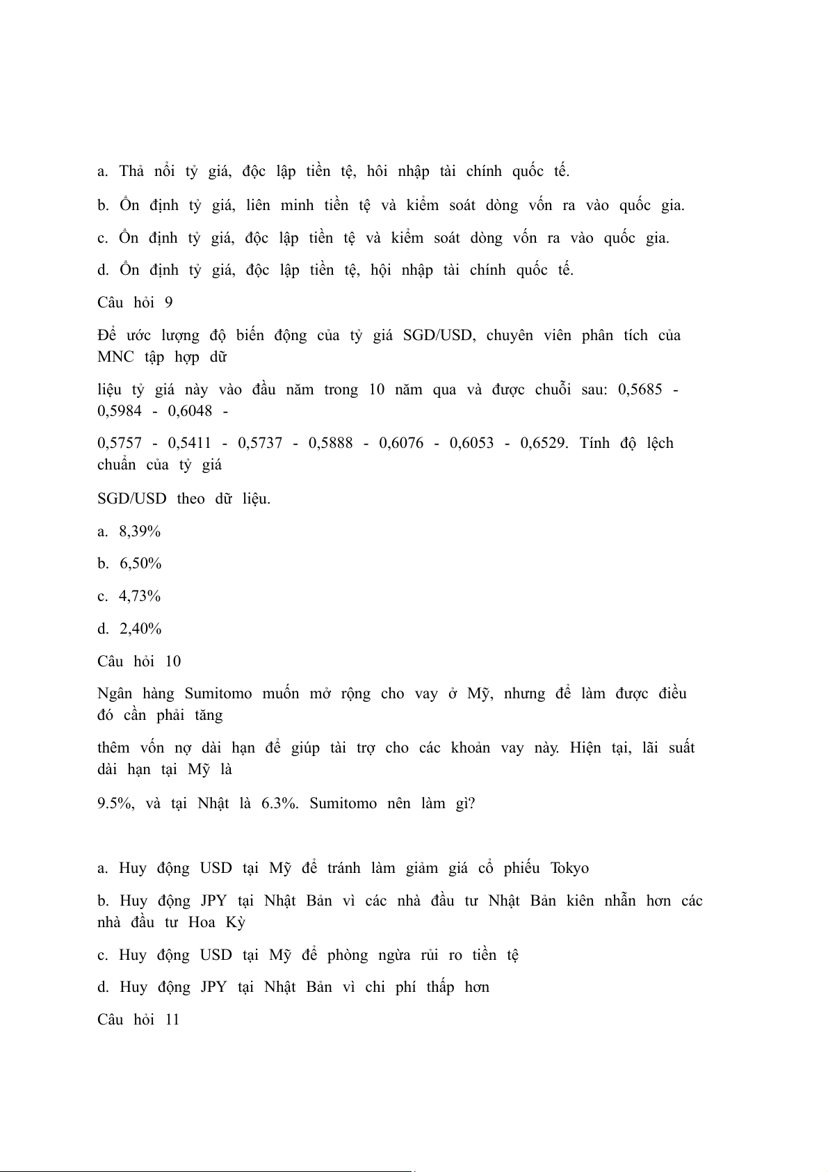 d. Ổn định tỷ giá, độc lập tiền tệ, hội nhập tài chính quốc tế. Câu hỏi 9