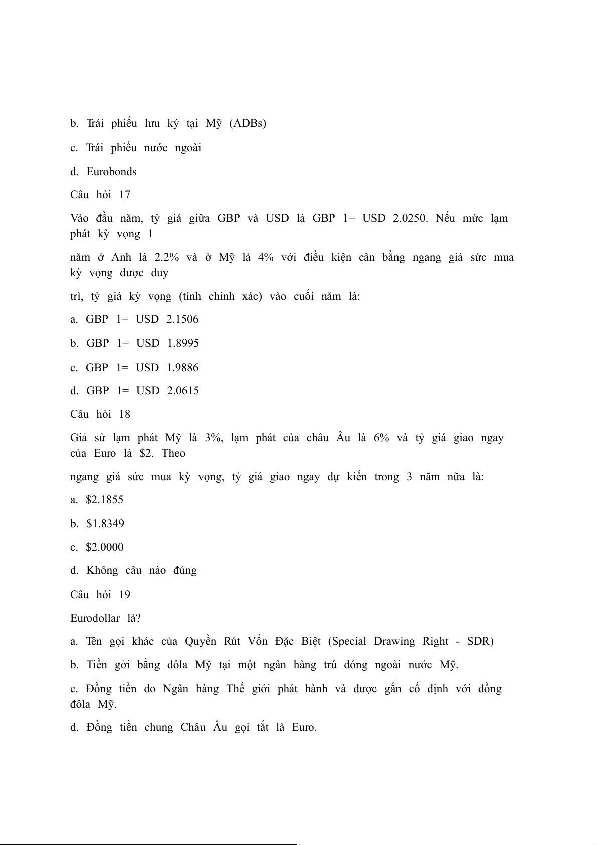trì, tỷ giá kỳ vọng (tính chính xác) vào cuối năm là: a. GBP 1= USD 2.1506 b. GBP 1= USD 1.8995 c. GBP 1= USD 1.9886 d. GBP 1= USD 2.0615 Câu hỏi 18