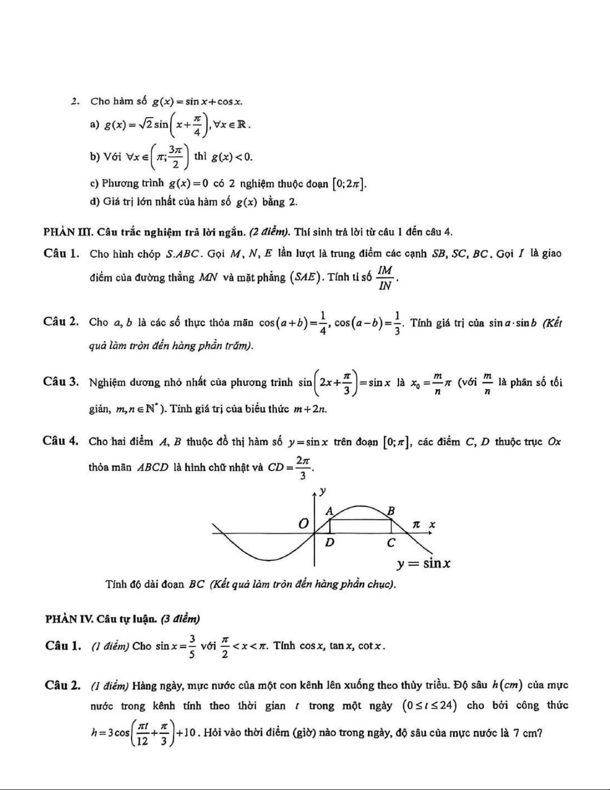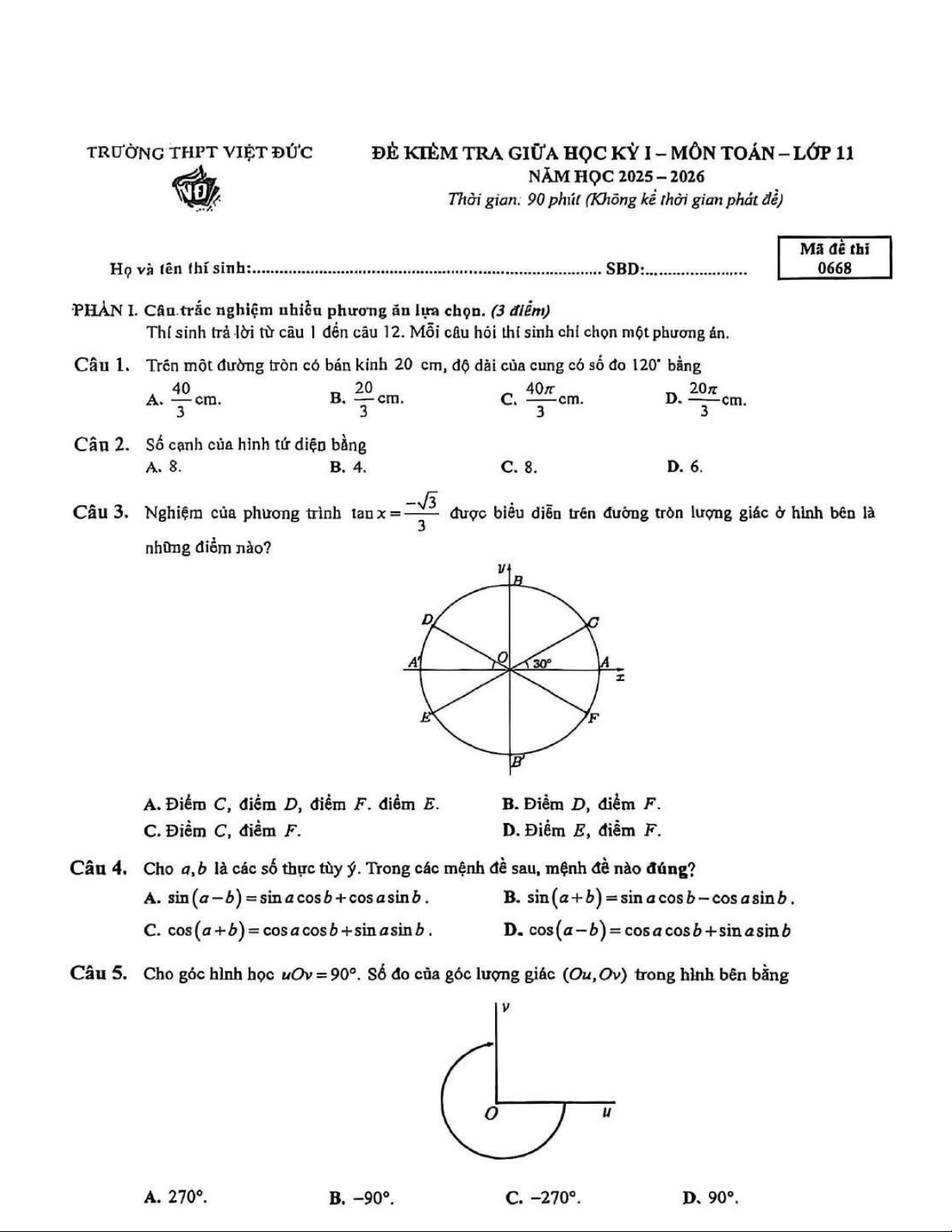 Đề giữa kỳ 1 Toán 11 năm 2025 – 2026 trường THPT Phan Việt Thống – Đồng Tháp