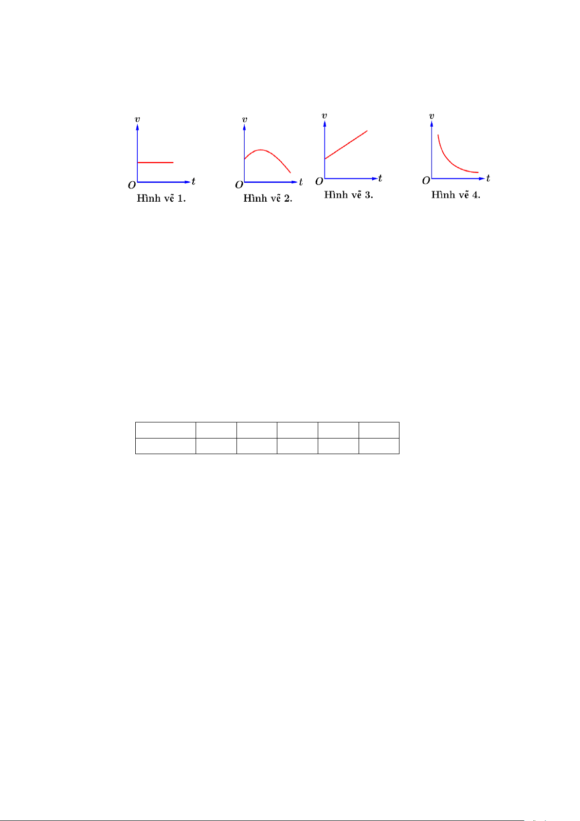 Câu 10. Trong các đồ thị vận tốc – thời gian dưới đây, đồ thị nào mô tả chuyển động thẳng biến đổi đều? A. Hình vẽ 2. B. Hình vẽ 1. C. Hình vẽ 3. D. Hình vẽ 4.