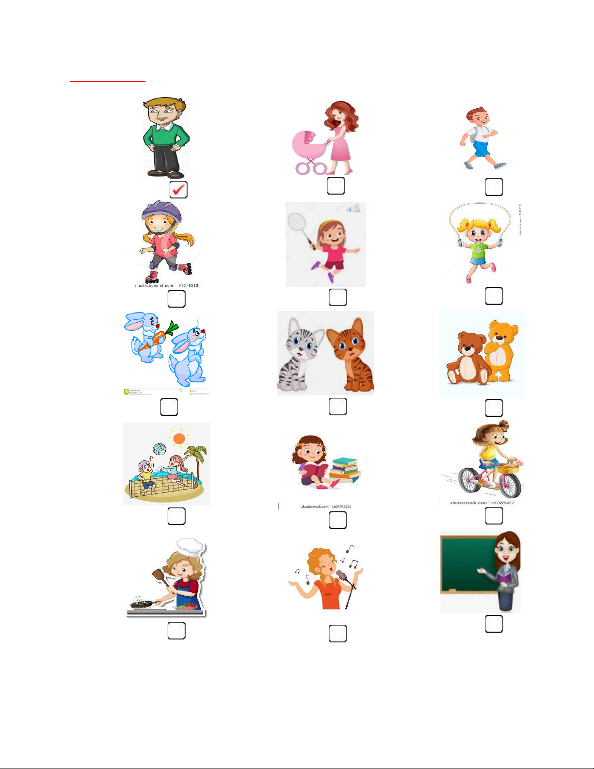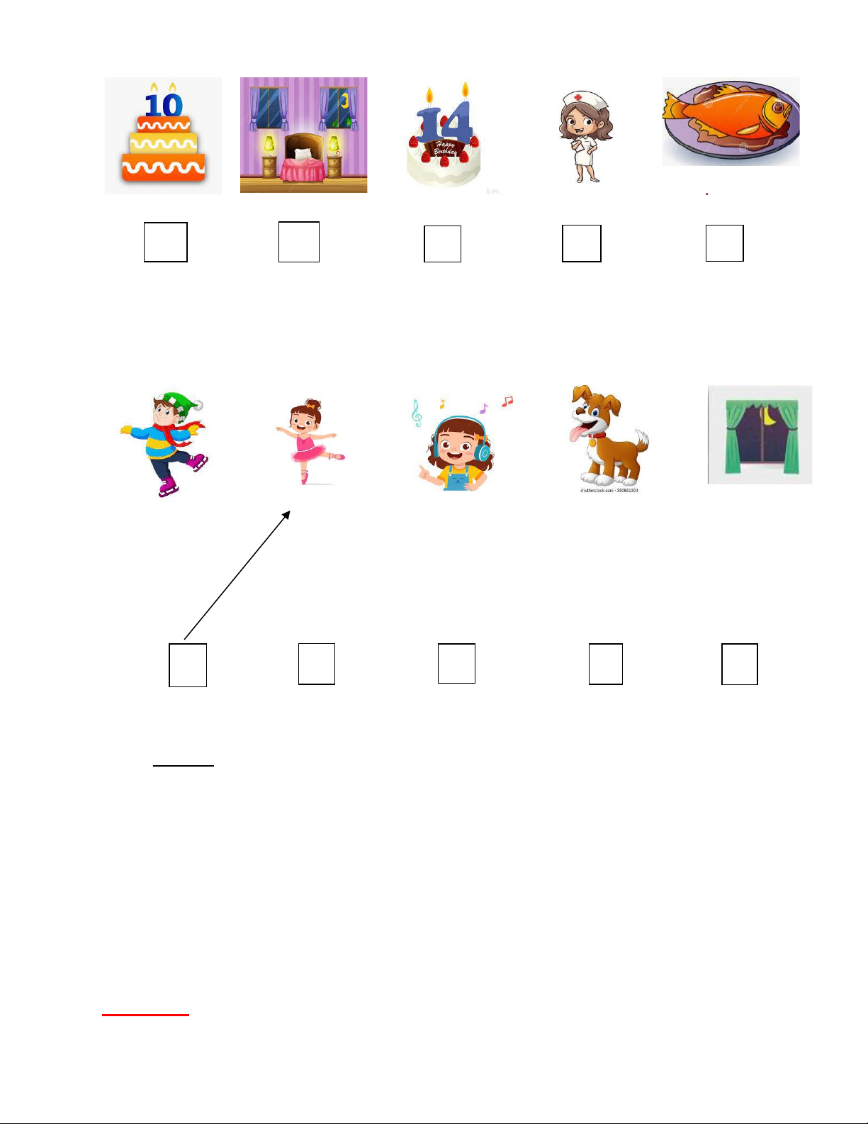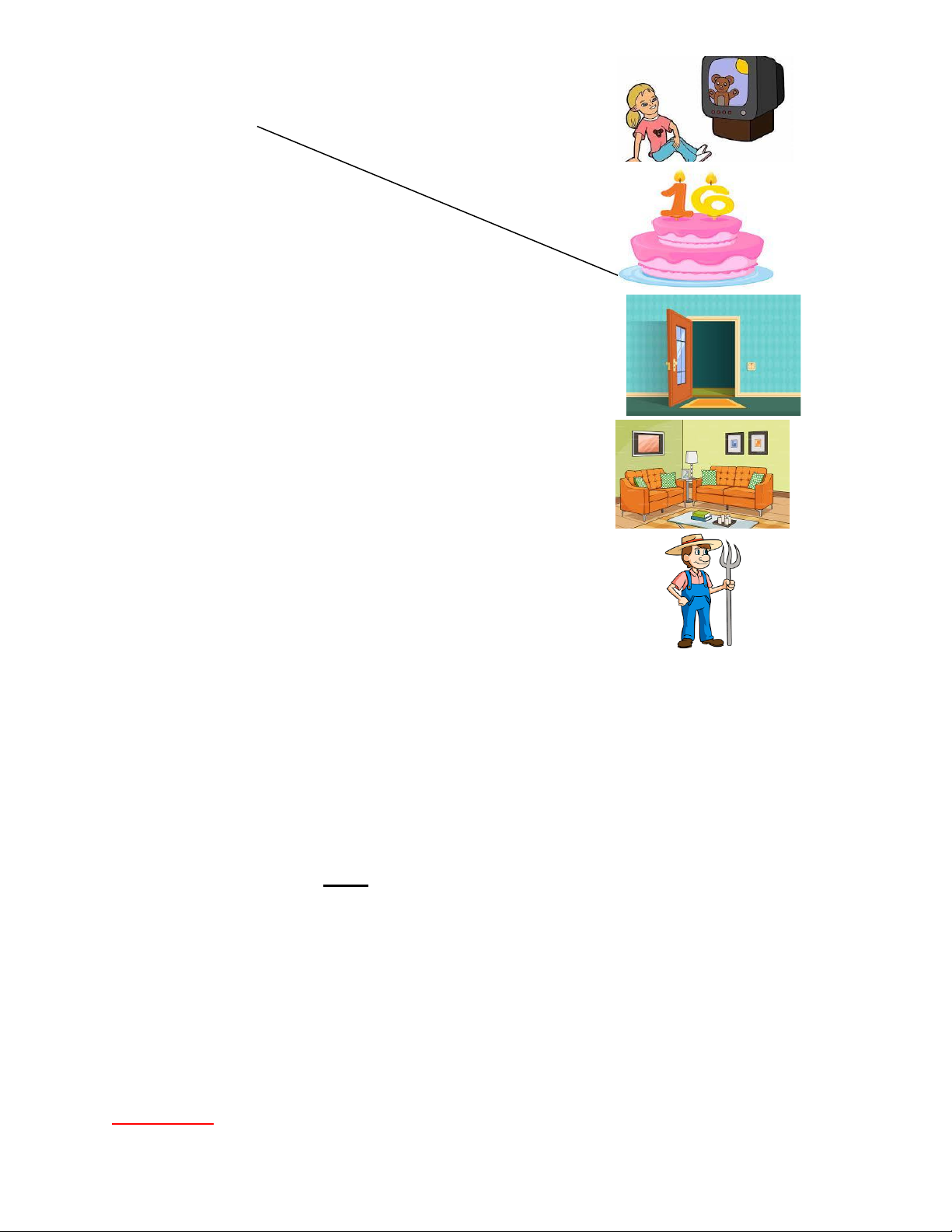PART 1: Read and match the words with pictures. There is one example. (1pt) Trang 2 (0) Example 0) sixteen A 1. living room B 2. farmer C 3. watching TV D 4. door E