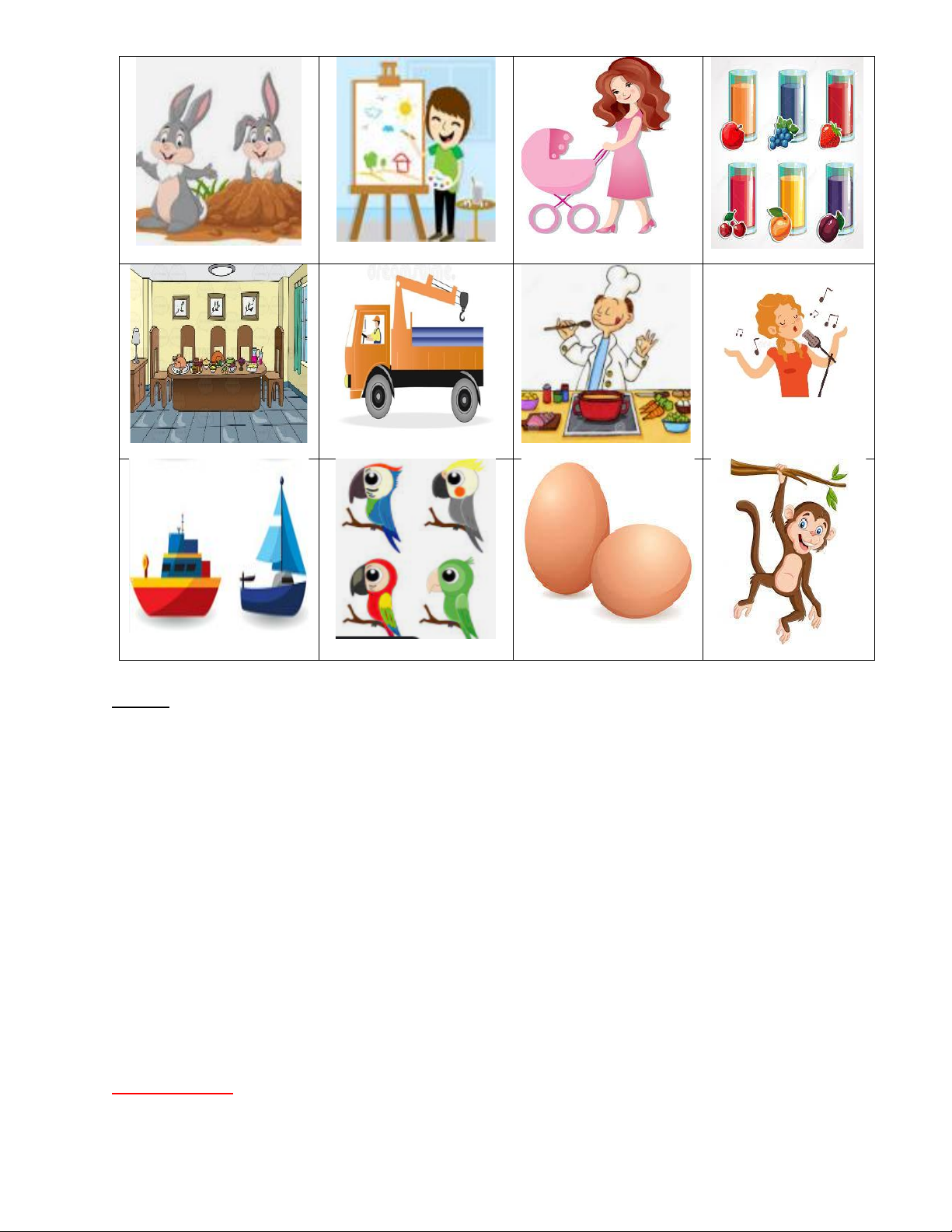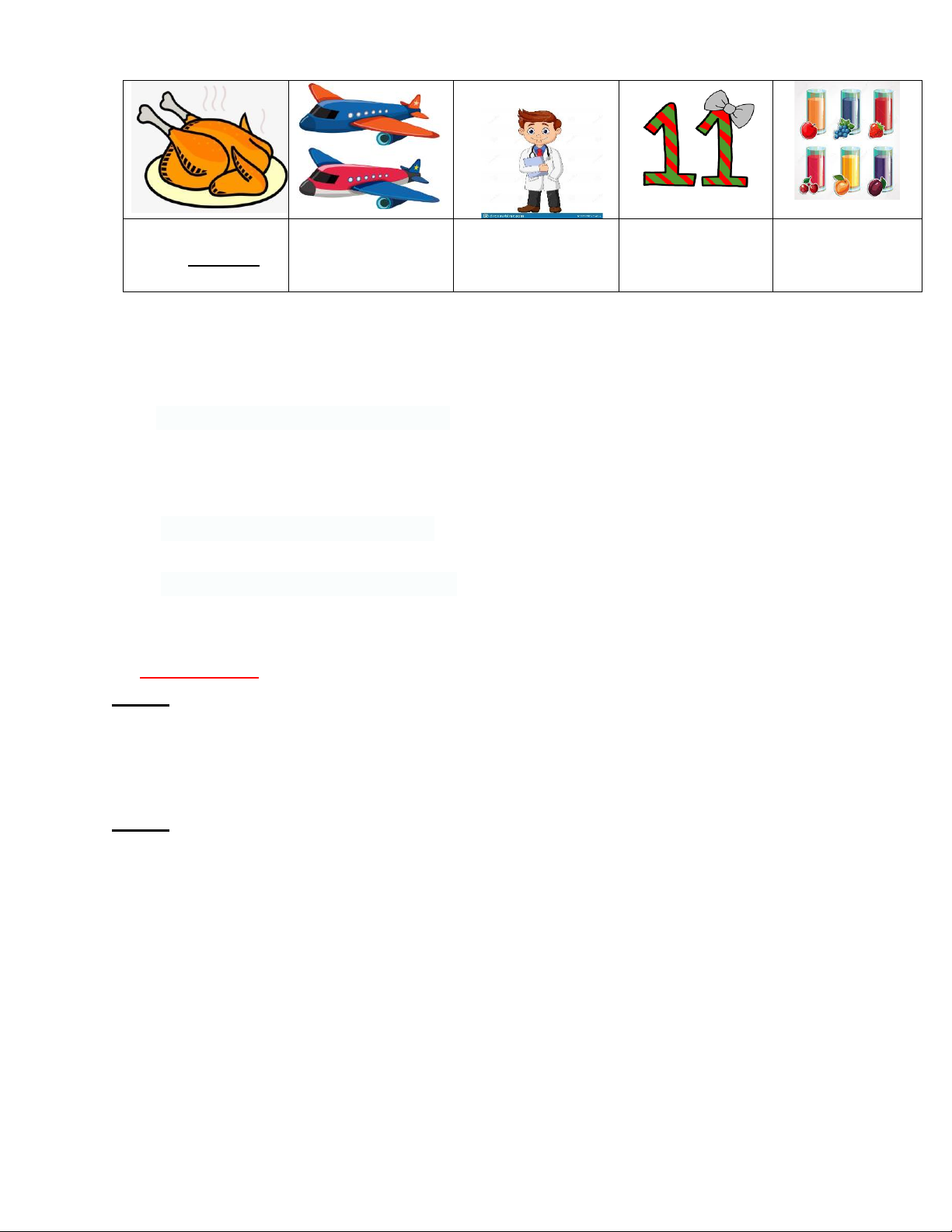 1. planes 2.doctor 3. eleven 4. juice PART 2 (0,25*4 = 1 pt ) 1.What would you like to eat? 2.Do you have any birds?