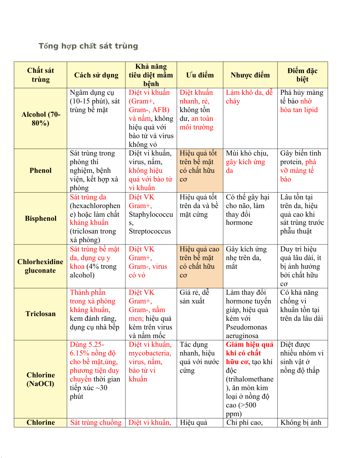Tổng hợp chất sát trùng Chất sát Khả năng Điểm đặc Cách sử dụng tiêu diệt mầm Ưu điểm Nhược điểm trùng biệt bệnh Ngâm dụng cụ