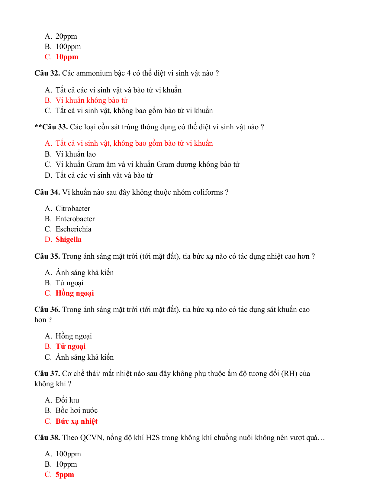 Câu 38. Theo QCVN, nồng độ khí H2S trong không khí chuồng nuôi không nên vượt quá… A. 100ppm B. 10ppm C. 5ppm pp