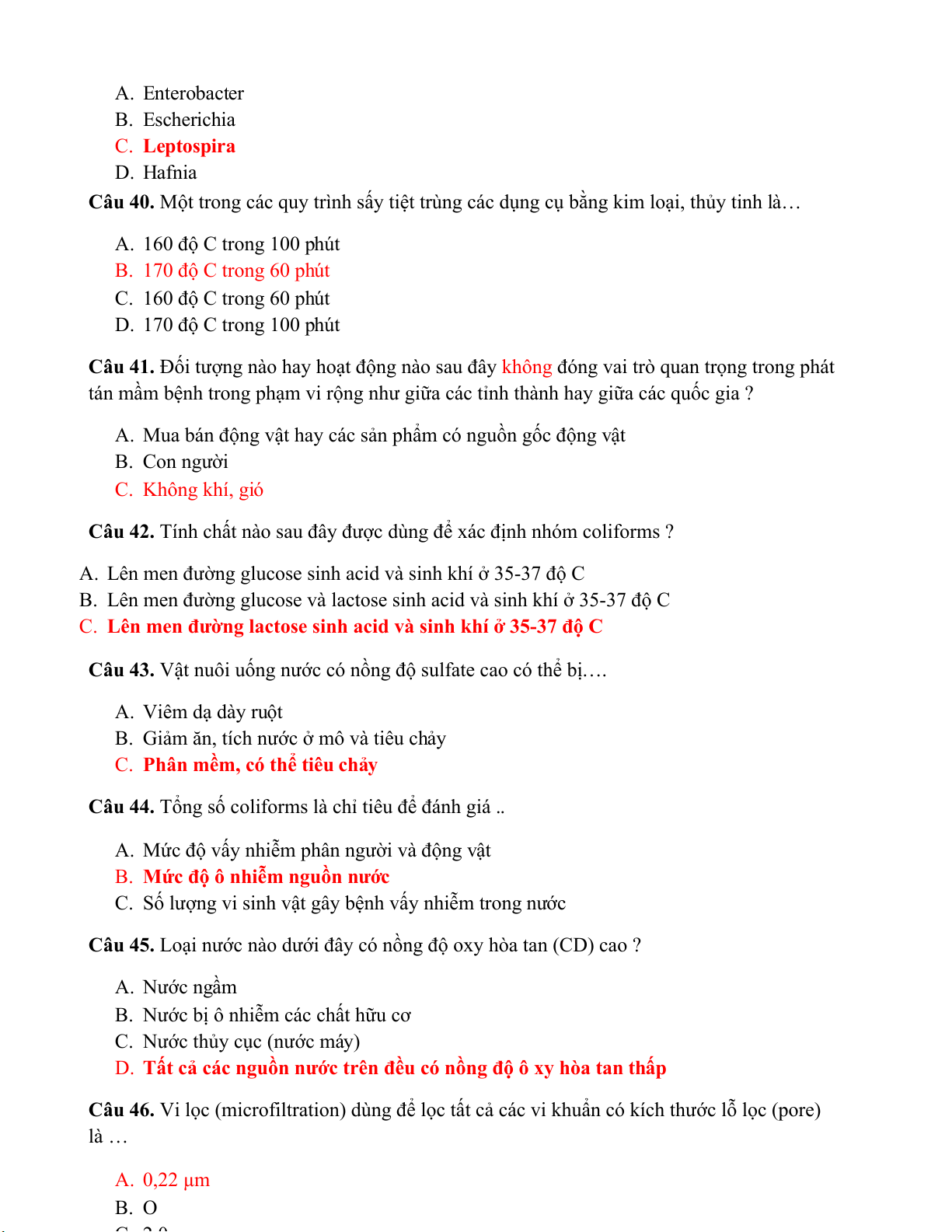 Câu 46. Vi lọc (microfiltration) dùng để lọc tất cả các vi khuẩn có kích thước lỗ lọc (pore) là … A. 0,22 µm B. O C 2 0 C. 2,0 µm D. 1,0 µm
