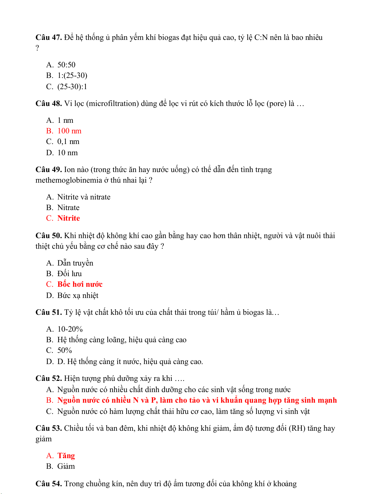 Câu 47. Để hệ thống ủ phân yếm khí biogas đạt hiệu quả cao, tỷ lệ C:N nên là bao nhiêu ? A. 50:50 B. 1:(25-30) C. (25-30):1