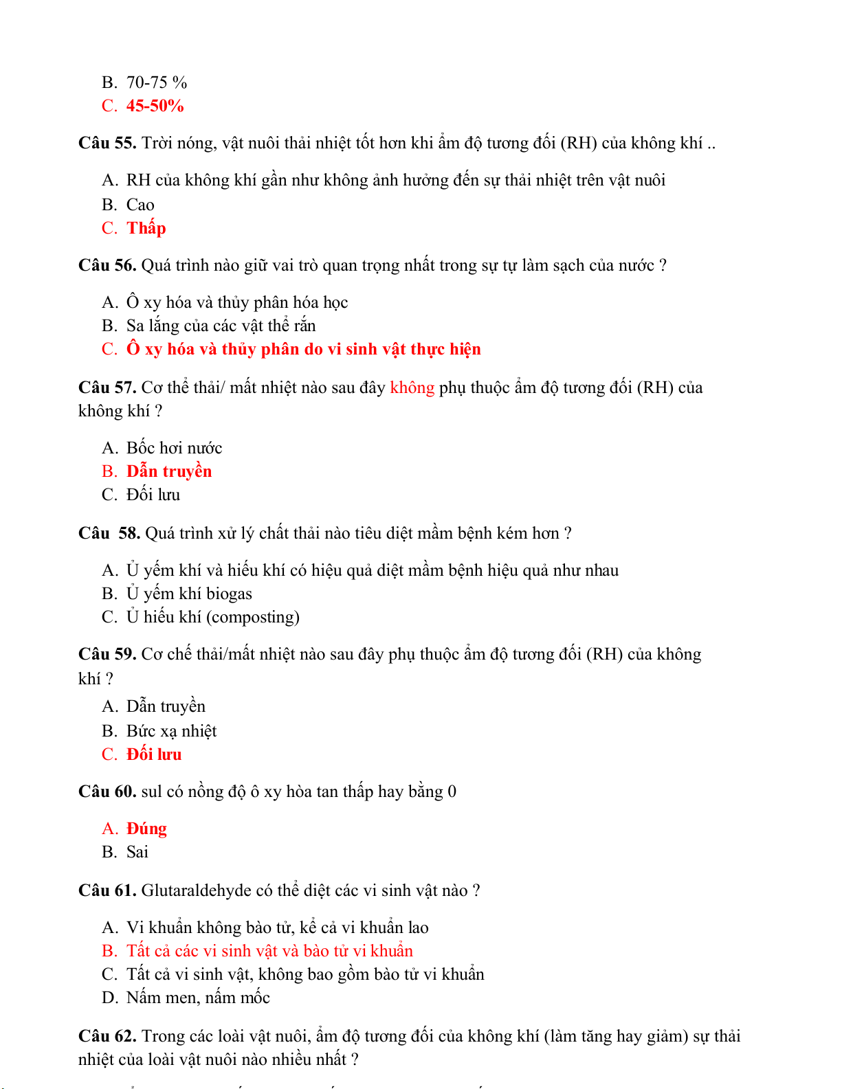 Câu 54. Trong chuồng kín, nên duy trì độ ẩm tương đối của không khí ở khoảng A. 60-65 %