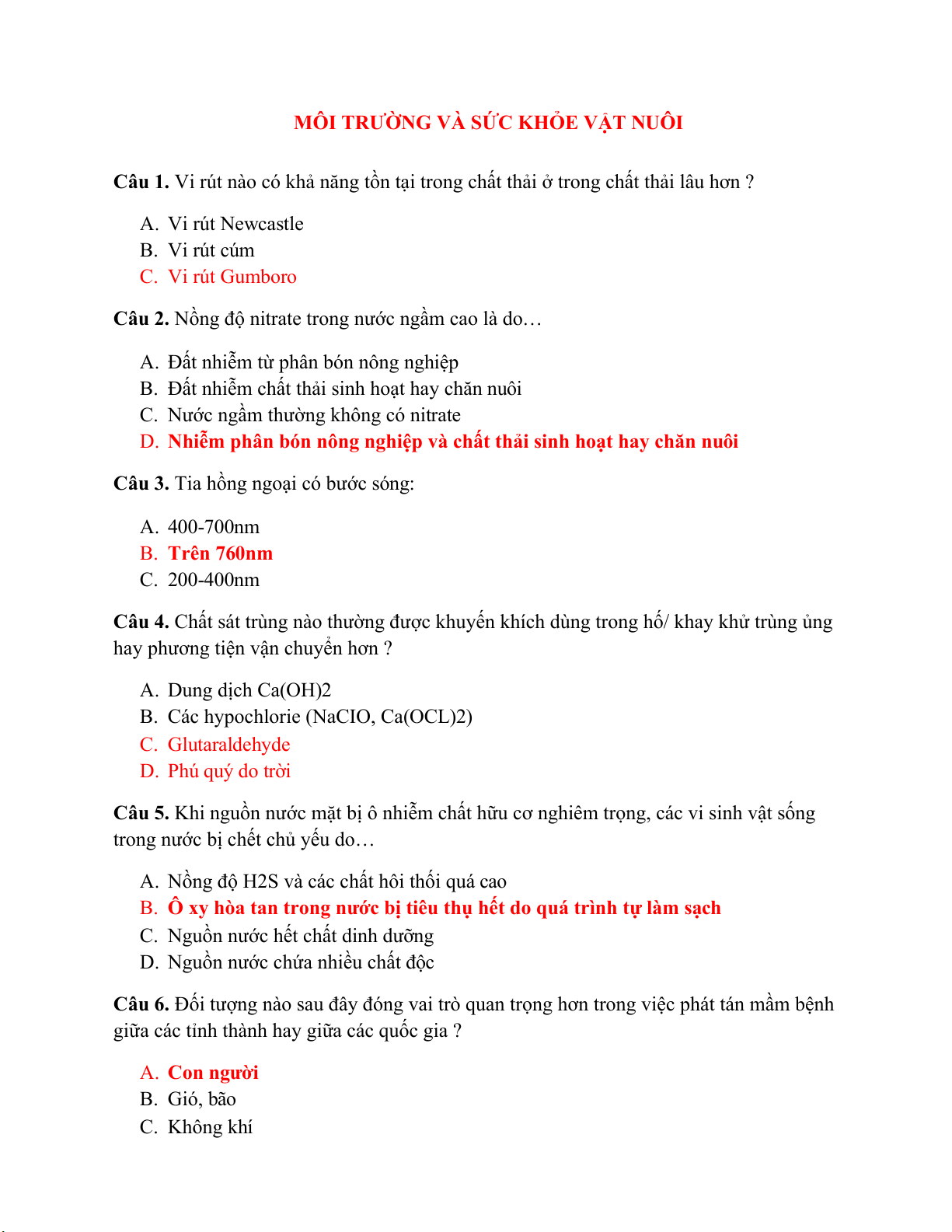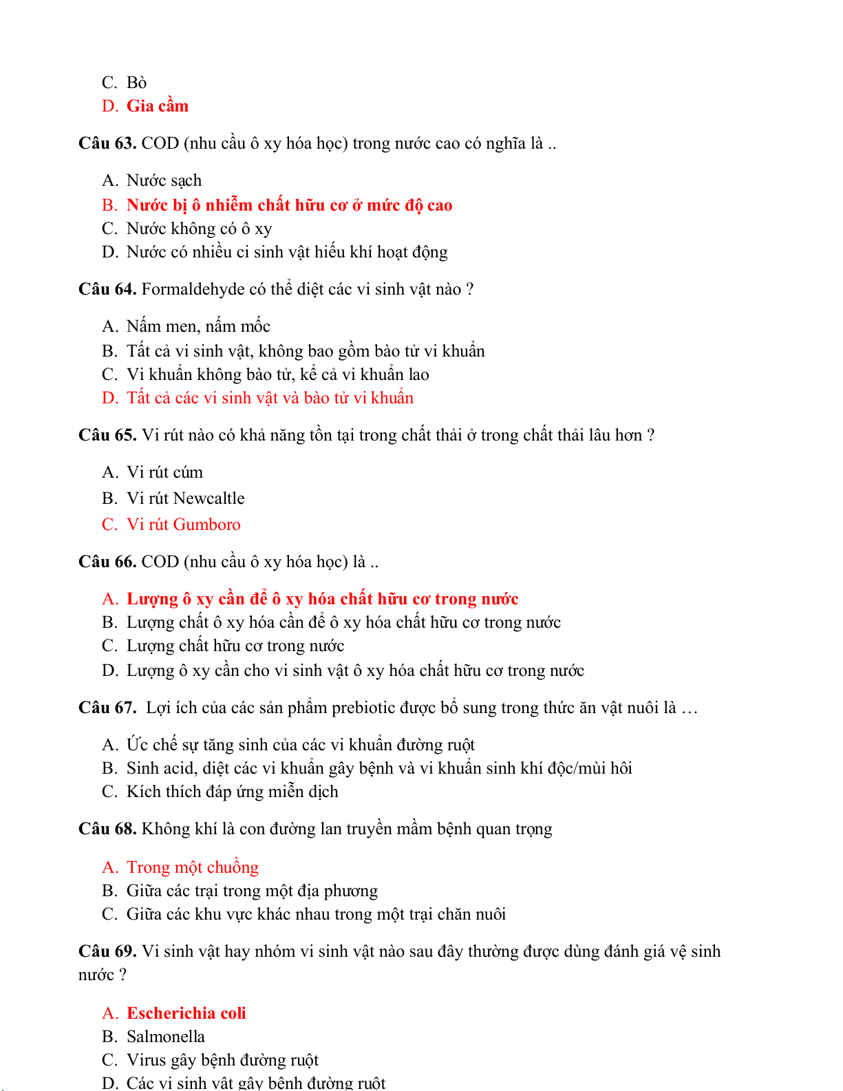 Câu 65. Vi rút nào có khả năng tồn tại trong chất thải ở trong chất thải lâu hơn ? A. Vi rút cúm B. Vi rút Newcaltle C. Vi rút Gumboro
