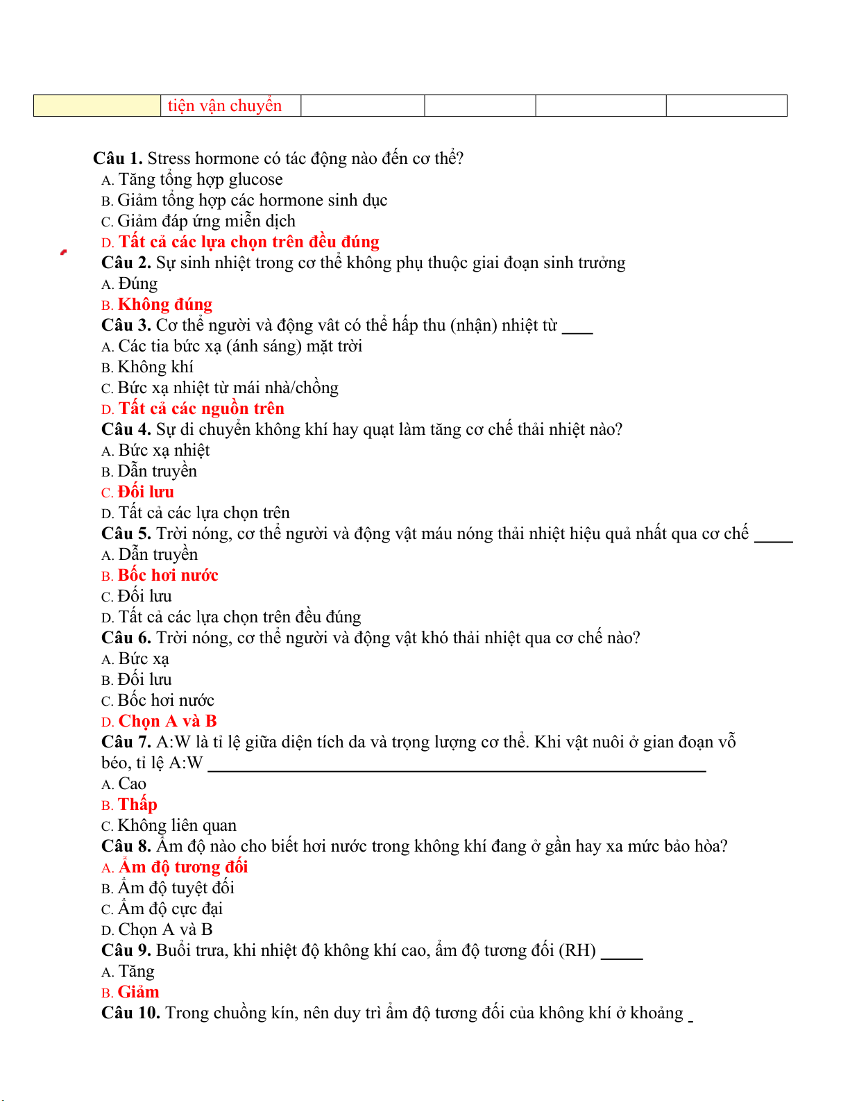 Câu 13. Cơ chế mất nhiệt nào sau đây tăng khi ẩm độ tương đối (RH) của không khí cao? A. Bức xạ nhiệt B. Bốc hơi nước C. Dẫn truyền D. Đối lưu