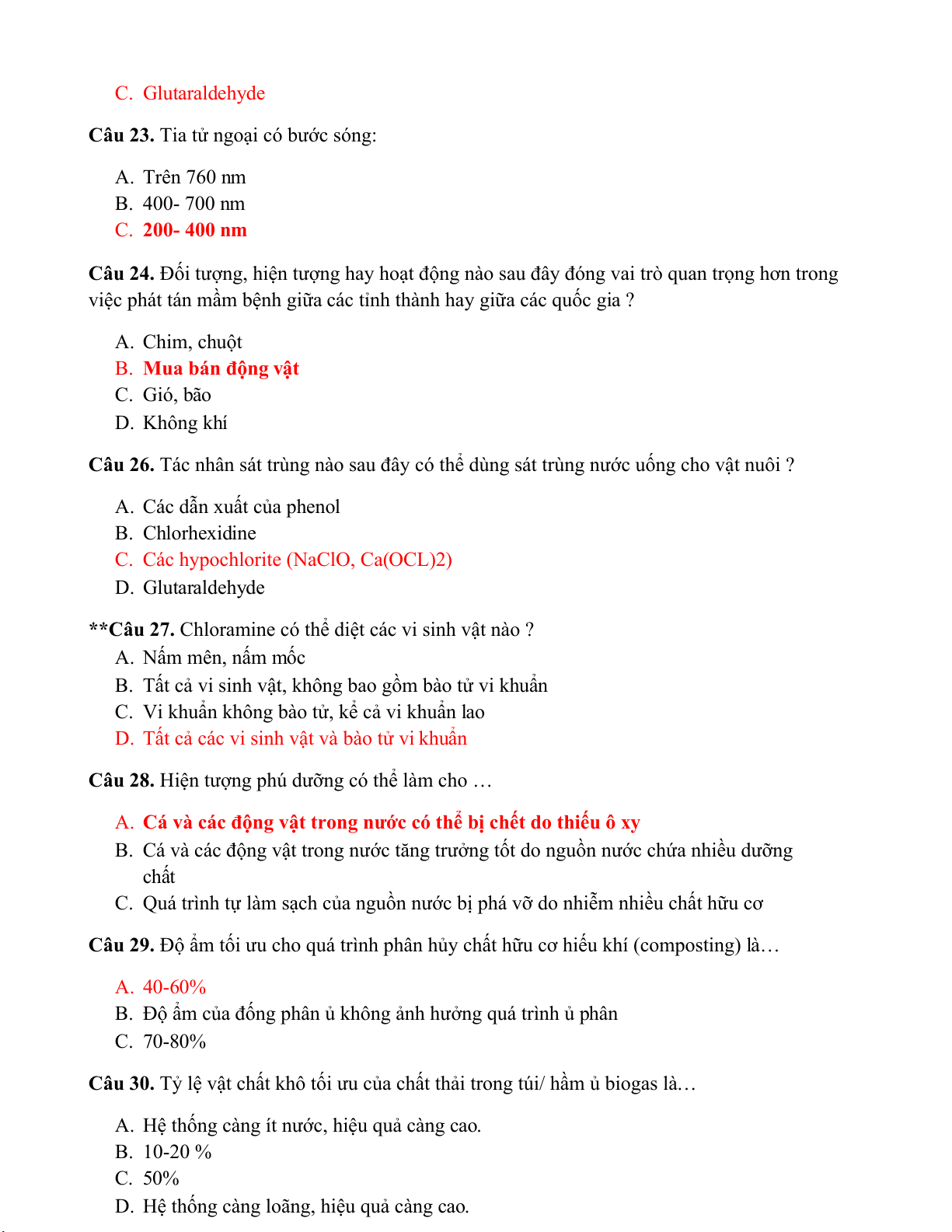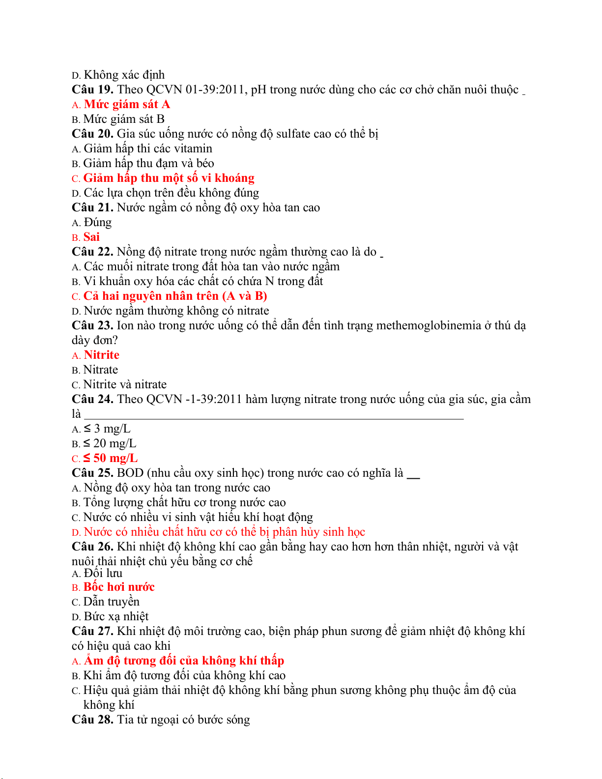 Câu 24. Theo QCVN -1-39:2011 hàm lượng nitrate trong nước uống của gia súc, gia cầm là A. ≤ 3 mg/L B. ≤ 20 mg/L C. ≤ 50 mg/L