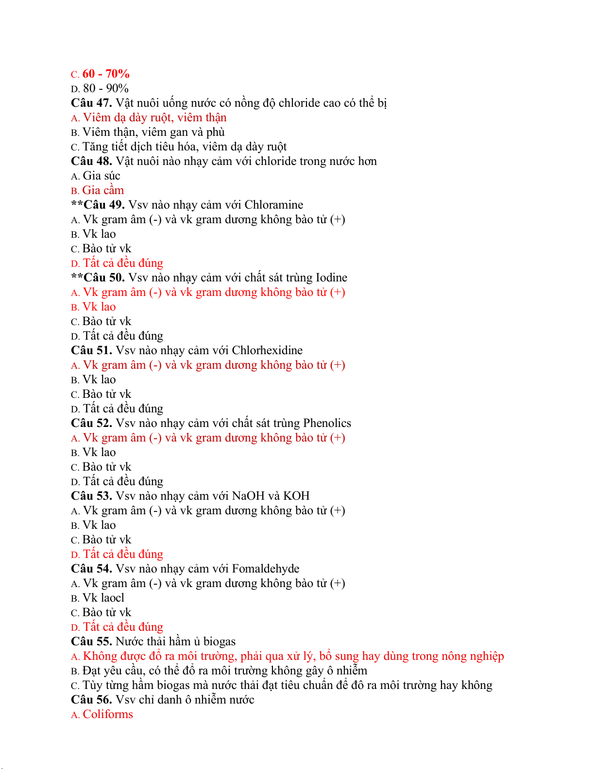 Câu 43. Vật nuôi uống nước có nồng độ sulfate cao có thể bị…. A. Viêm dạ dày ruột