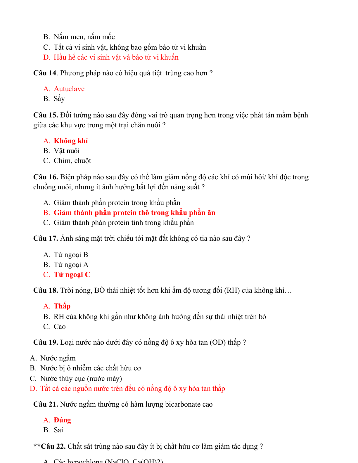 Câu 16. Theo dõi chỉ số nhiệt - ẩm (heat index, heat stress index) có ý nghĩa nhất đối với loài vật nuôi nào? A. Bò B. Heo C. Gà