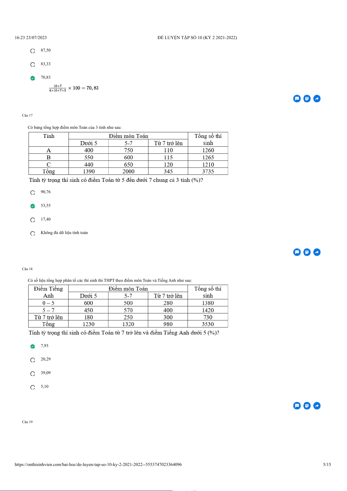 ĐỀ LUYỆN TẬP SỐ 10 (KỲ 2 2021-2022) 87,50 83,33 70,83 Giải thích: Câu 17