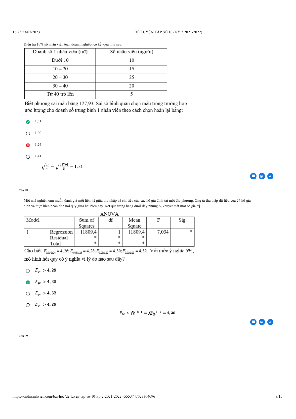 Điều tra 10% số nhân viên toàn doanh nghiệp, có kết quả như sau: 1,31 1,00 1,24 1,41 Giải thích: Câu 28