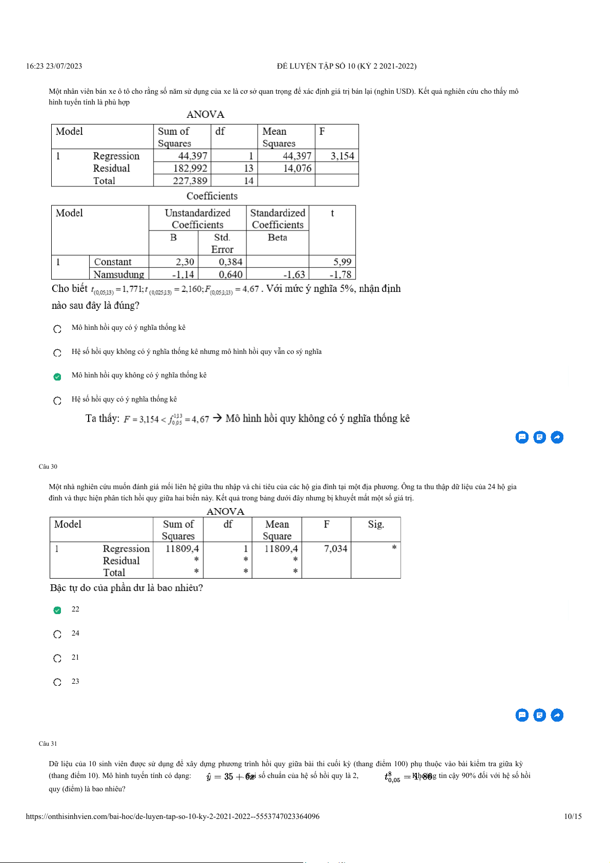 Hệ số hồi quy có ý nghĩa thống kê Giải thích: Câu 30