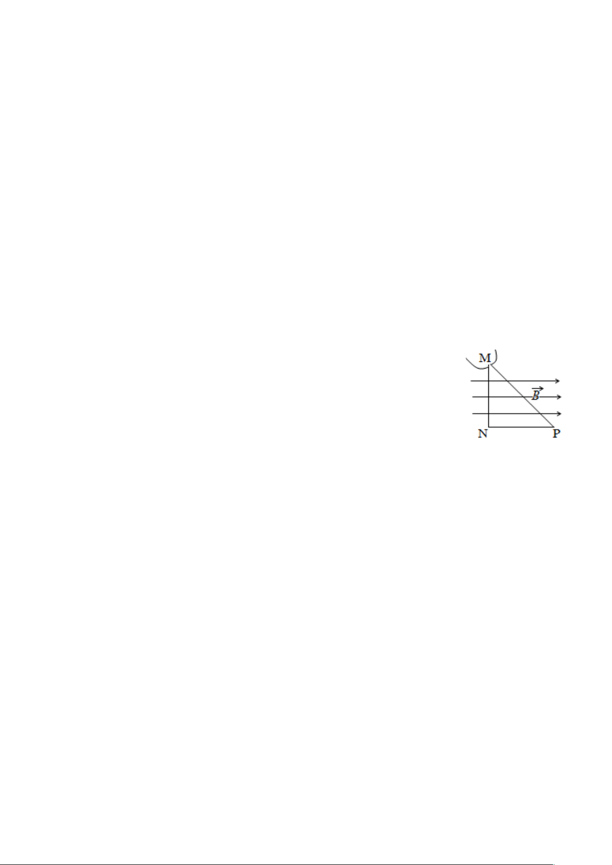 Câu 6. Dòng điện 10A chạy qua khung dây tam giác vuông cân MNP theo chiều MNPM có MN = NP = 10cm đặt trong từ trường đều. Cảm ứng từ B = 10-2T song song với NP như hình vẽ. Lực từ tác dụng lên cạnh NP của khung dây là bao nhiêu?(tính bằng đơn vị mN)