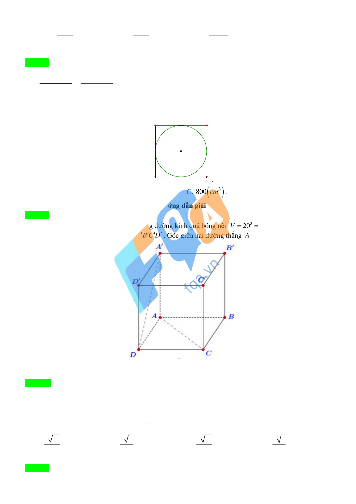 Câu 34: Một quả bóng có bán kính 10(cm) được đặt khít vào một hộp cứng dạng hình hộp. Tính thể tích khối hộp đó. . A. ( 3 4000 cm ) . B. ( 3 4000 cm ) . C. ( 3 800 cm ) . D. ( 3 8000 cm ) .