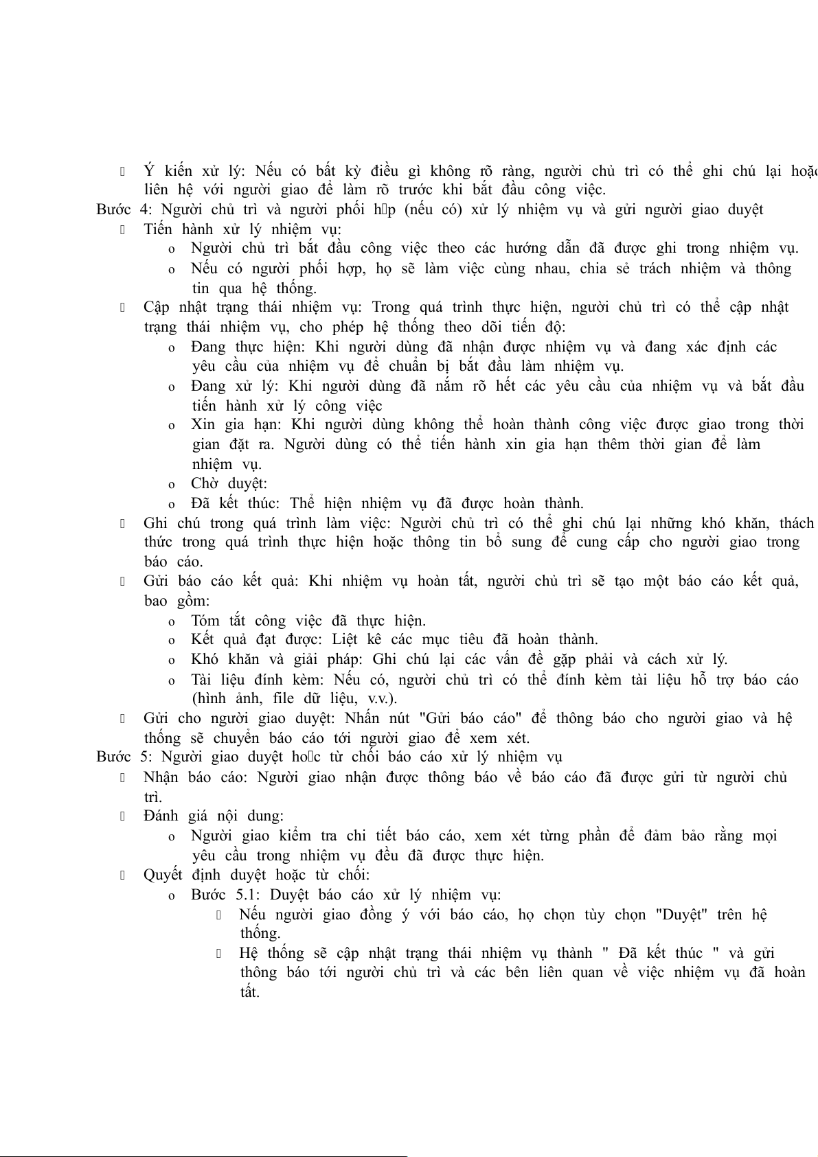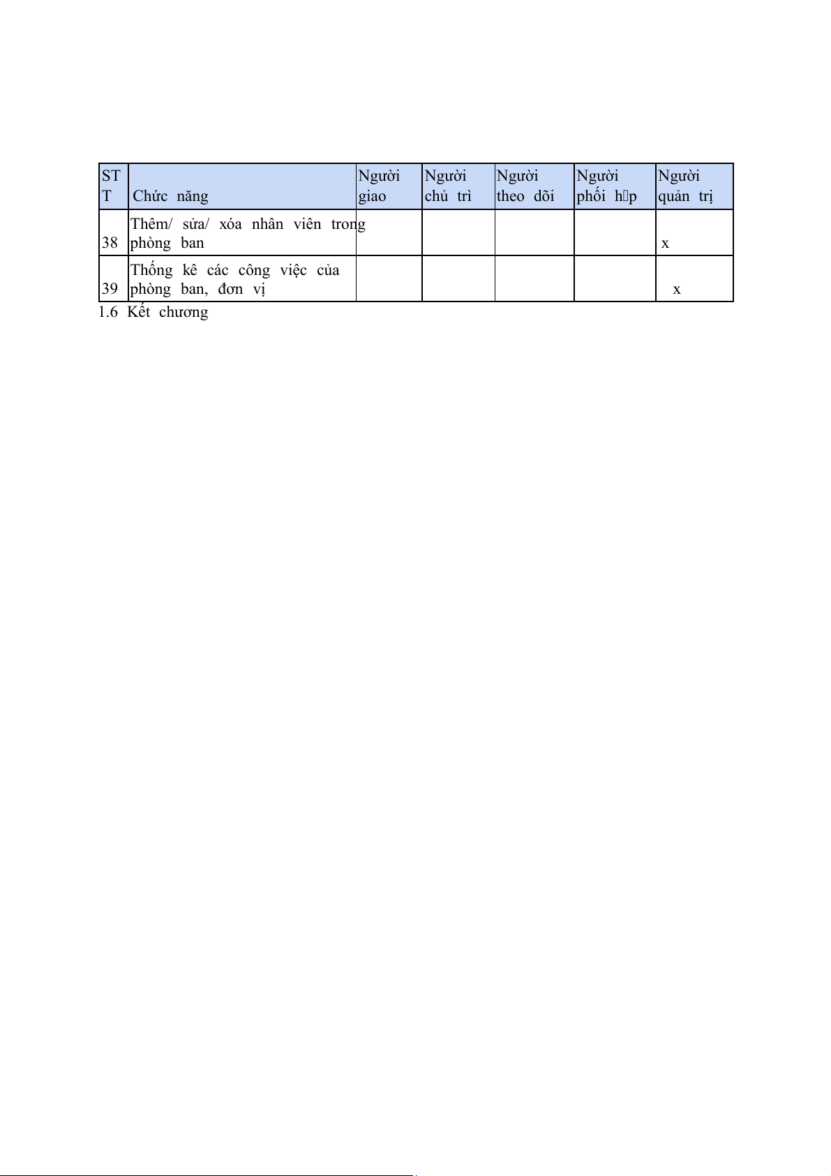 Người Người Người Người Người T Chức năng giao chủ trì theo dõi phối h p quản trị 9 Báo cáo tiến độ x x 10 Xin gia hạn x 11 Trả lại nhiệm vụ x 12 Xóa nhiệm vụ x 13 Chỉnh sửa nhiệm vụ x x