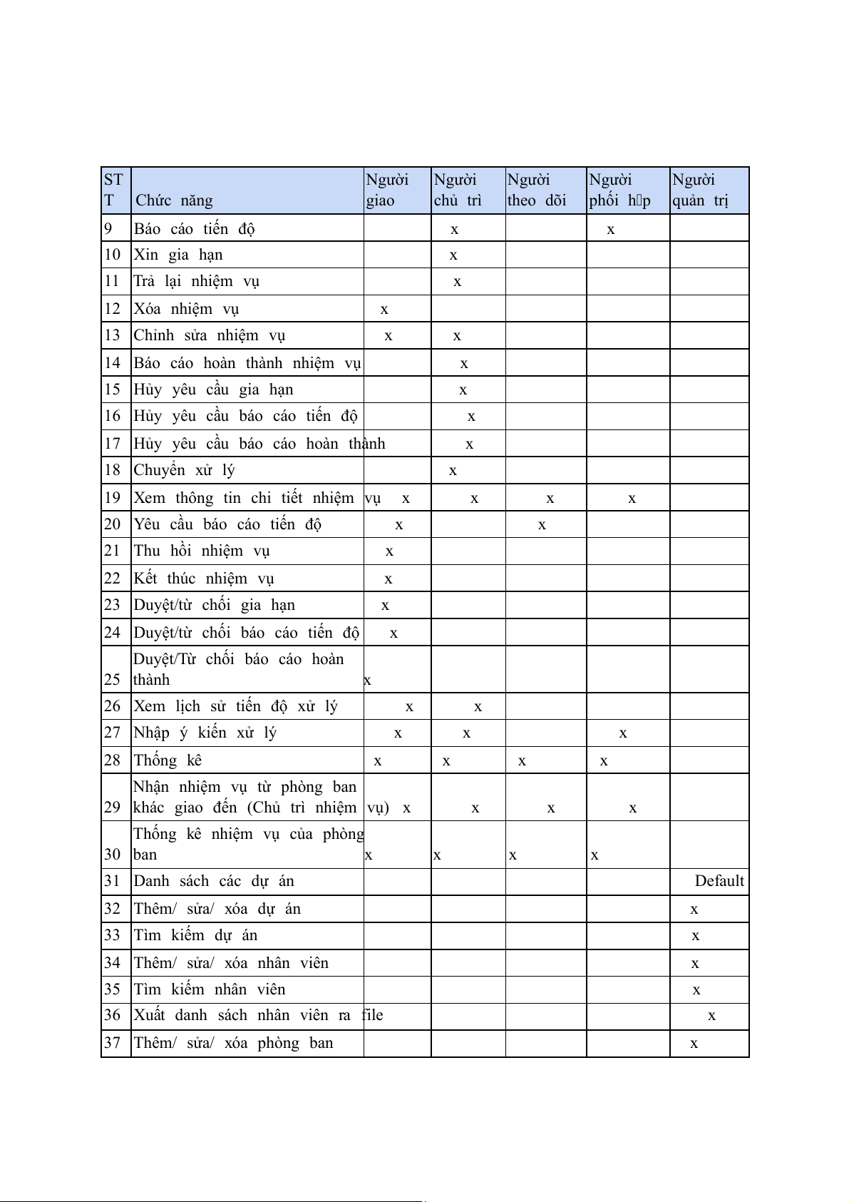 Thống kê nhiệm vụ của phòng 30 ban x x x x 31 Danh sách các dự án Default 32 Thêm/ sửa/ xóa dự án x 33 Tìm kiếm dự án x