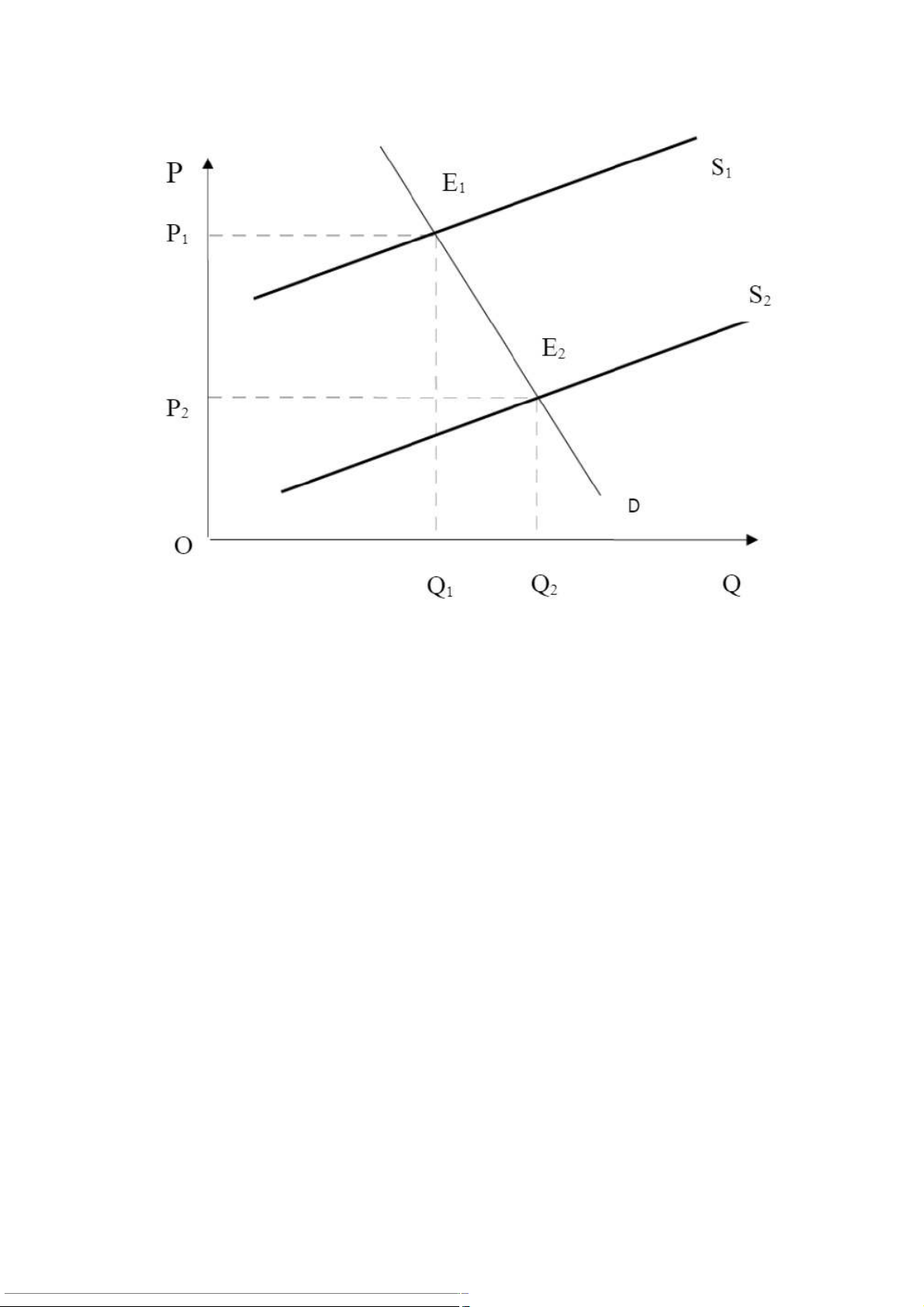 Nhìn hình vẽ ta thấy, khi cân bằng ban đầu bằng E1 với mức giá cân bằng là P1 và