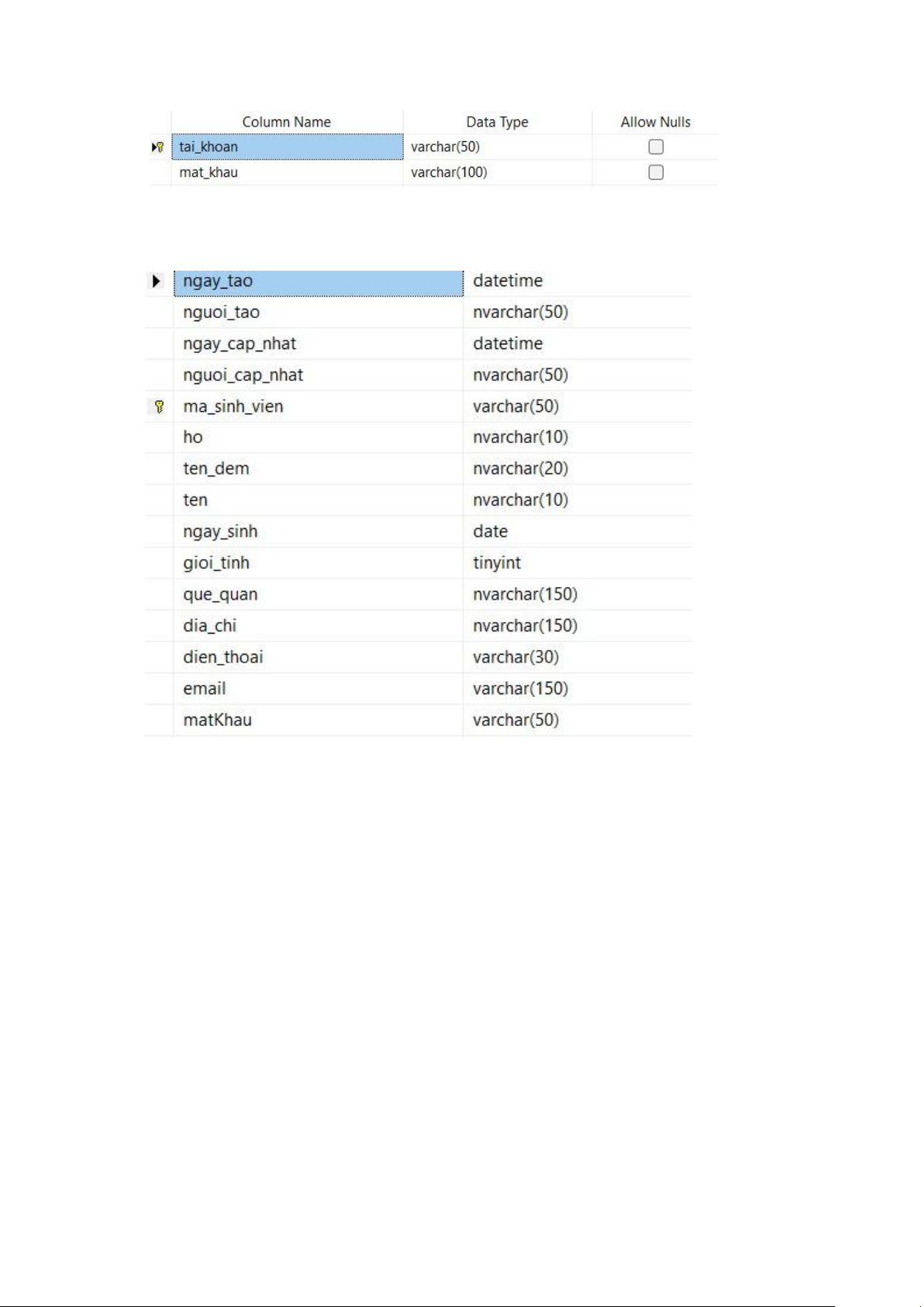 Gồm có 2 cột tài khoản và mật khẩu dùng để đăng nhập vào phần mềm • Table Sinh viên: