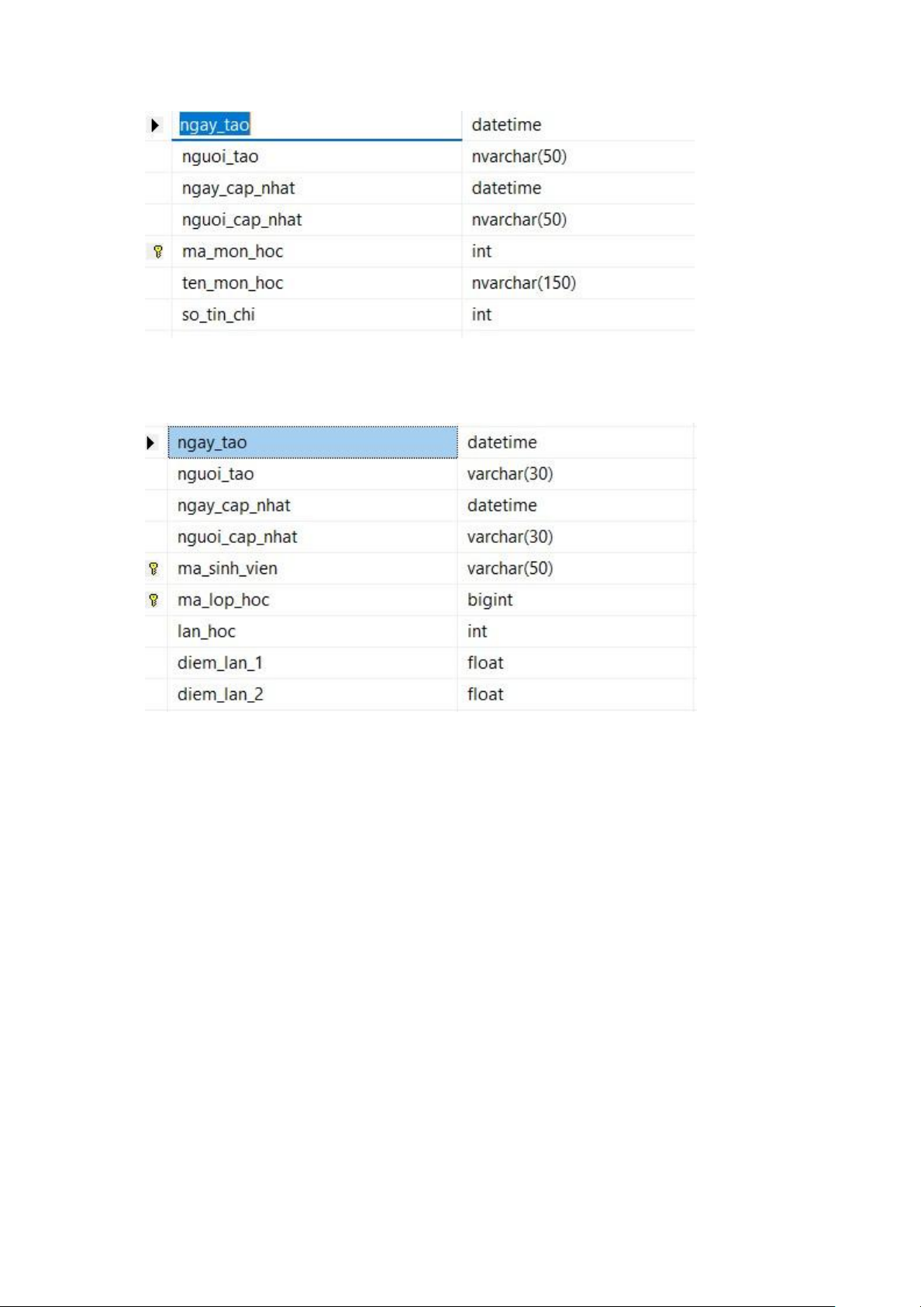 Gồm những chi tiết của môn học: mã môn học, tên môn học, số tín chỉ. • Table Điểm: