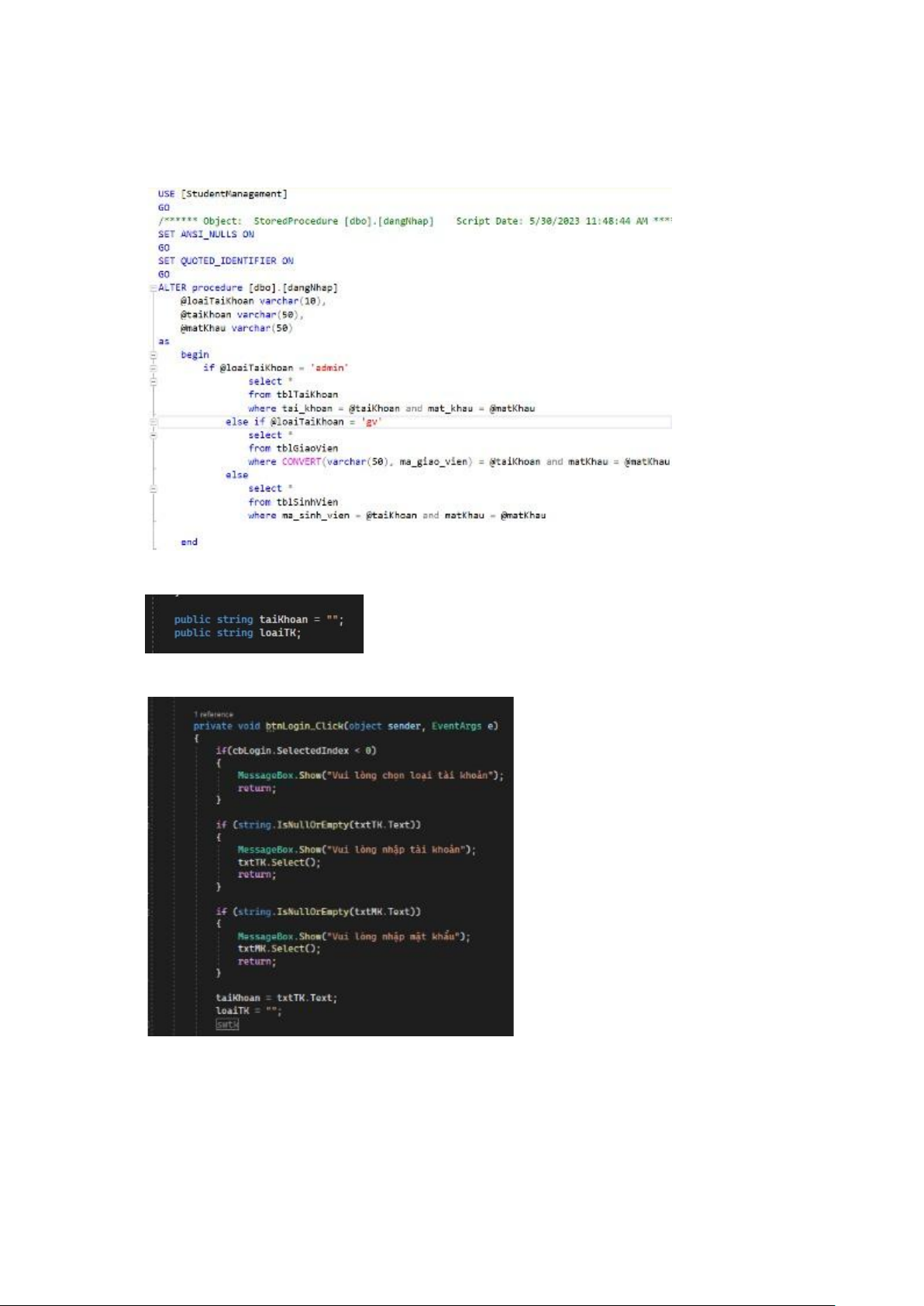 Tạo Procedure và sử dụng lệnh truy vấn để thiết kế “Đăng Nhập” cùng tài khoản và mật khẩu. •