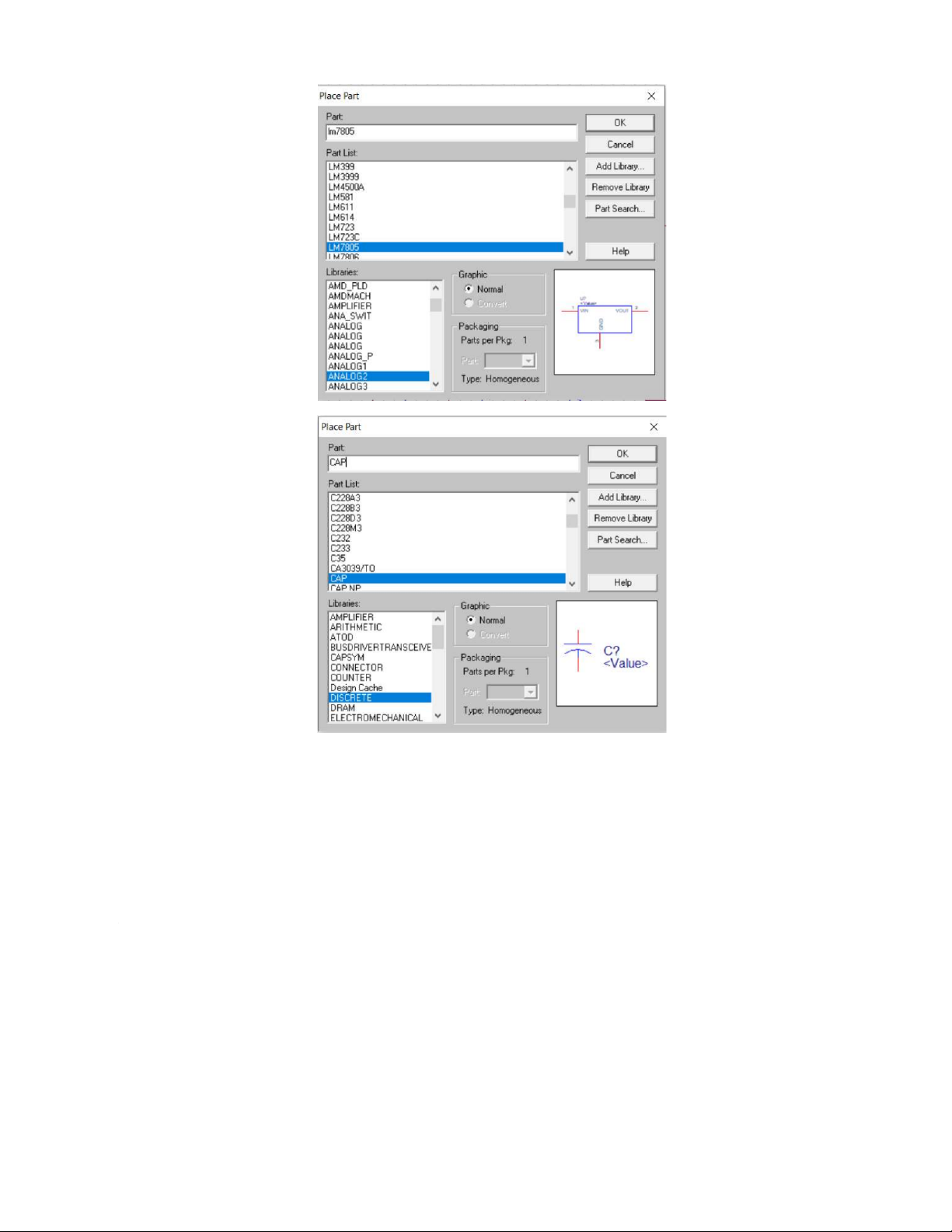 Tiếp theo, chúng ta tiến hành lấy những linh kiện cần sử dụng, cụ thể như bảng sau Linh kiện Part Library Số lượng IC LM7805 LM7805 ANALOG2 1 Tụ điện CAP DISCRETE 5 Điện trở R DISCRETE 6 Transistor 2N1069 TRANSISTOR 1