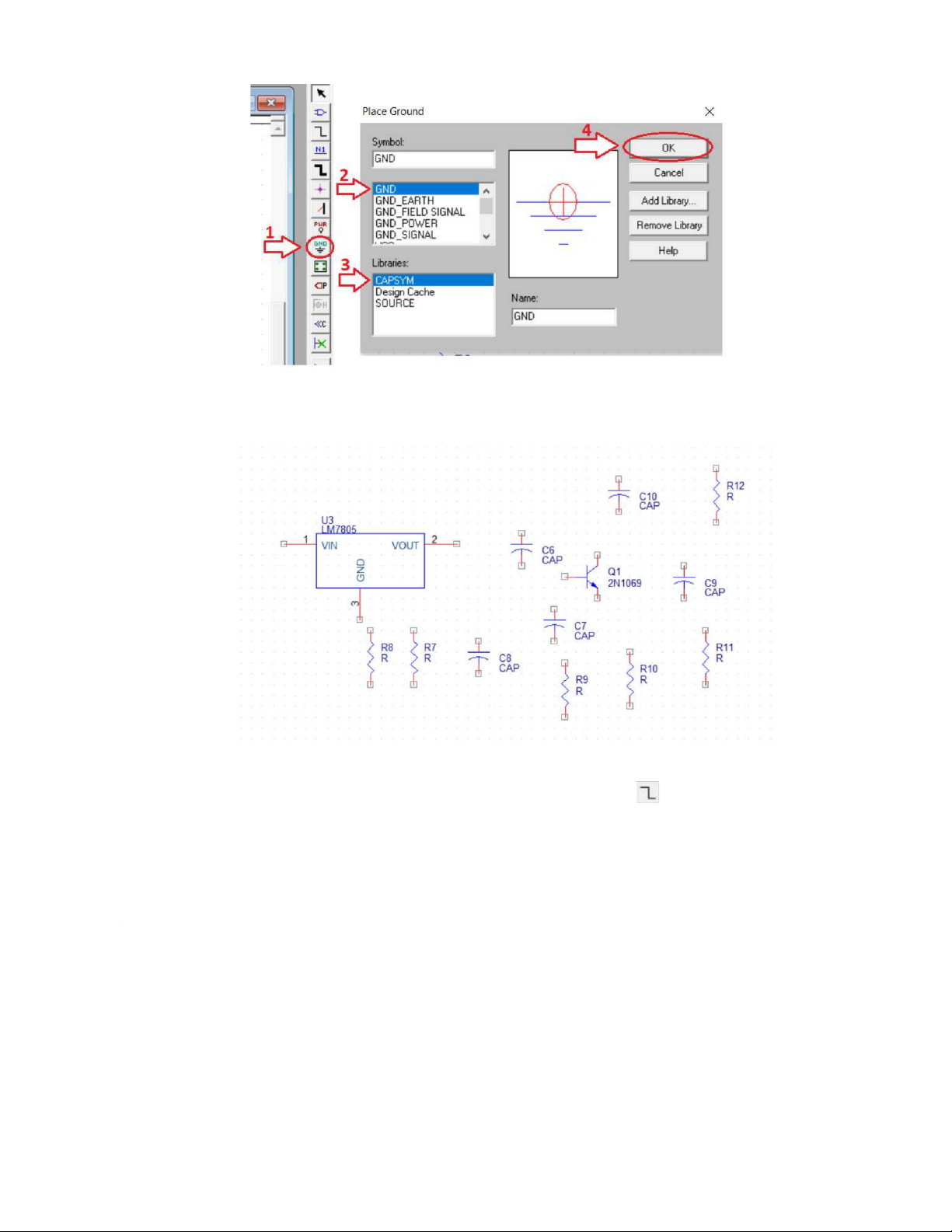 Để lấy mass, ta chọn Place ground ở thanh công cụ bên tay phải rồi chọn CAPSYM ở mục