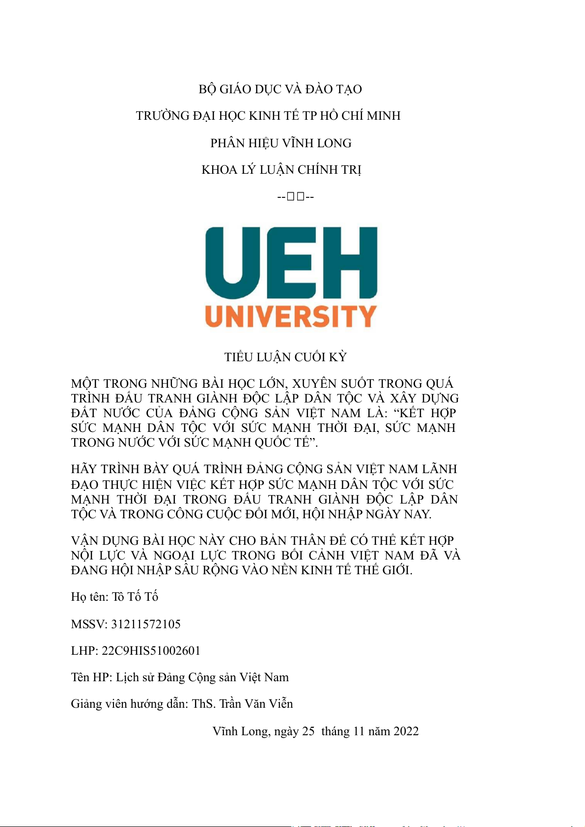 TRƯỜNG ĐẠI HỌC KINH TẾ TP HỒ CHÍ MINH PHÂN HIỆU VĨNH LONG KHOA LÝ LUẬN CHÍNH TRỊ -- -- TIỂU LUẬN CUỐI KỲ